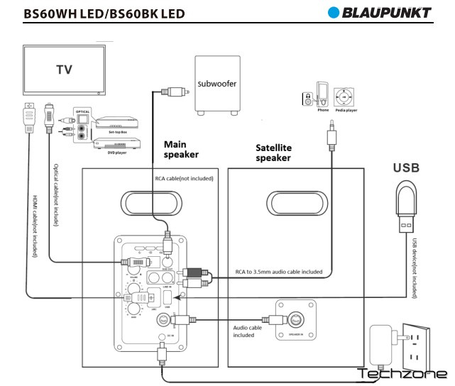 Завдяки оптичному входу можна безпосередньо підключити цифрове джерело – це може бути аудіо з ігрової консолі, сигнал із звукової карти настільного комп'ютера або сигнал із цифрової приставки для ефірного телебачення. На задній панелі основного динаміка також розташований RCA-вхід для аналогового аудіосигналу. Ви можете використовувати його для підключення практично до будь-якого аналогового джерела. Це може бути програвач вінілу, такий як BLAUPUNKT VT100 із вбудованим передпідсилювачем, це також може бути аудіо з DJ-пульта або аудіосигнал зі старого типу телевізора.
