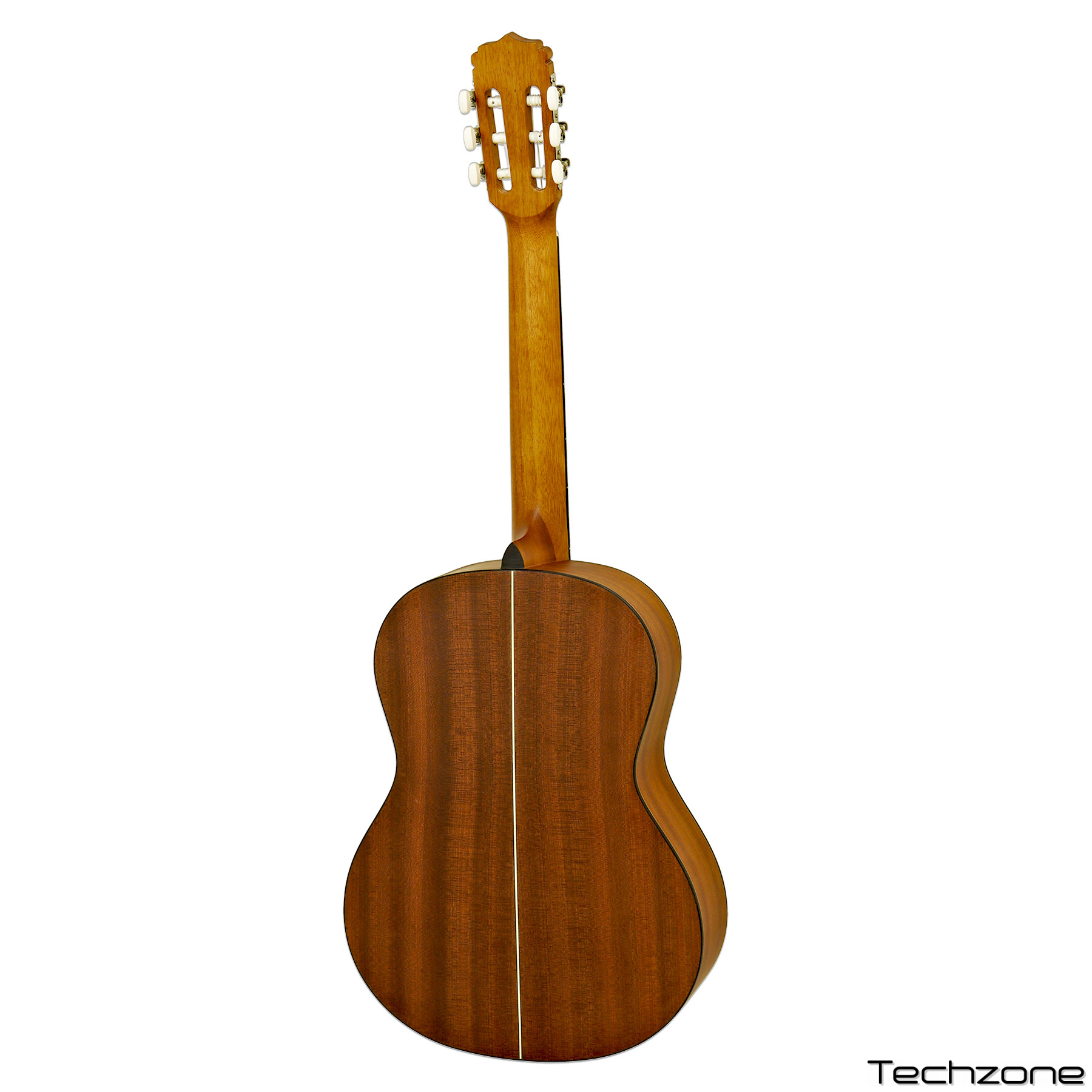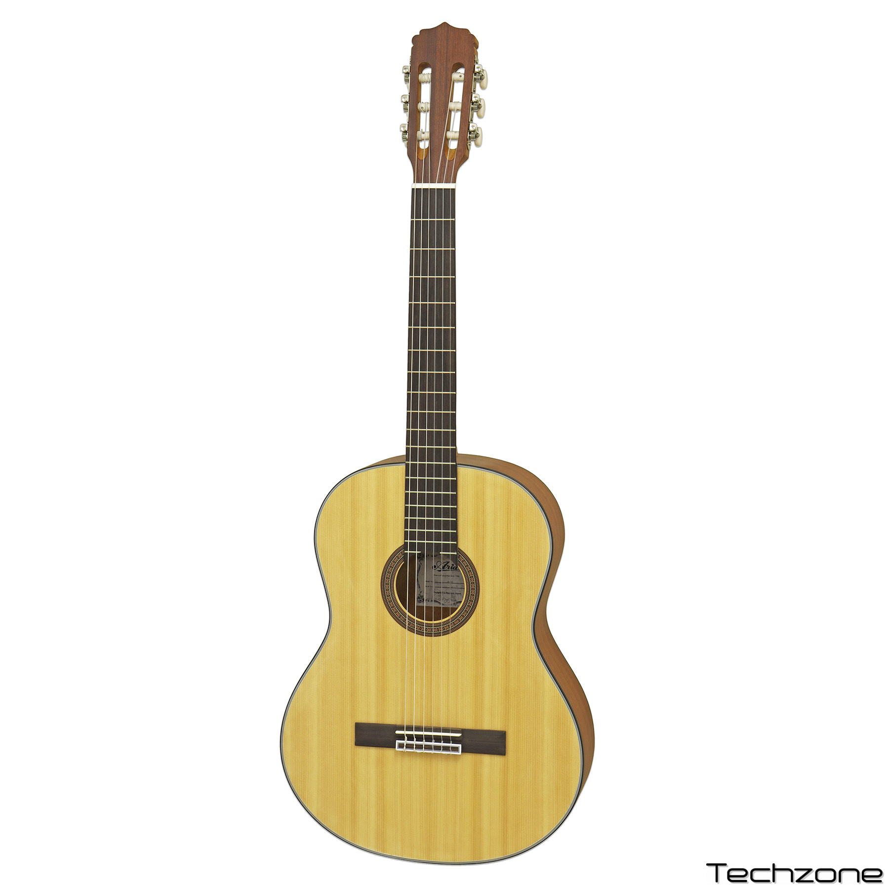 Акустична класична гітара. Верхня дека: ялина Задня дека та обичайки: сапелі Гриф: нато З’єднання грифа: ластівчин хвіст (Dovetail) Накладка грифа: палісандр Кількість ладів: 19 Верхній поріжок: ABS Ширина поріжка: 52 мм Мензура: 650 мм (25-1/2″) Бридж: палісандр Седло: ABS Фурнітура: хром Покриття: матовий натуральний Чохол в комплекті