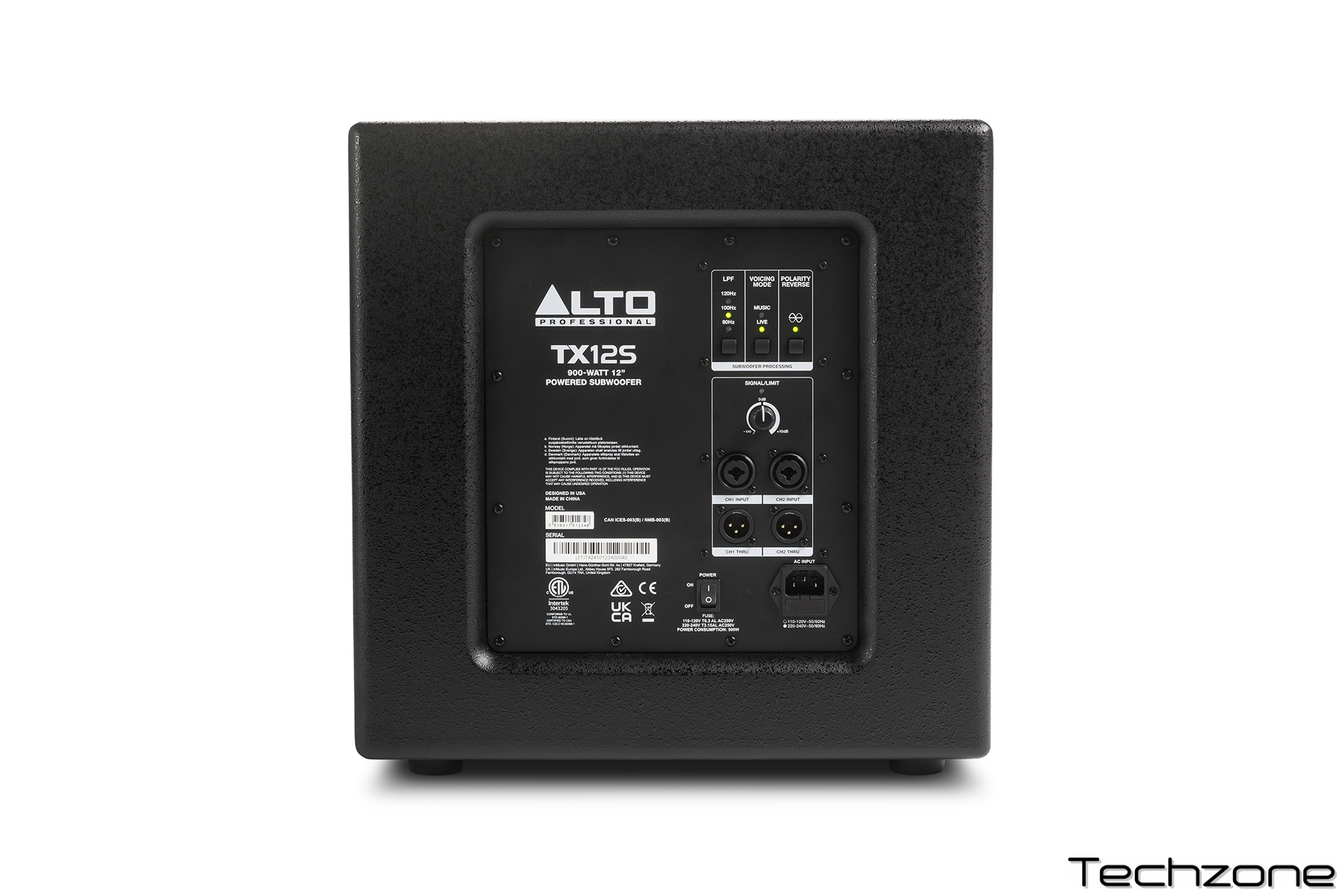 TX12S створено, щоб витримувати будь-які навантаження. Корпус сабвуфера виготовлений з ДВП, є міцним, не резонуючим та фактично покращує властиві пристрою акустичні якості. Крім того, цей сабвуфер та всі інші продукти серії TX розроблені та налаштовані у Сполучених Штатах.