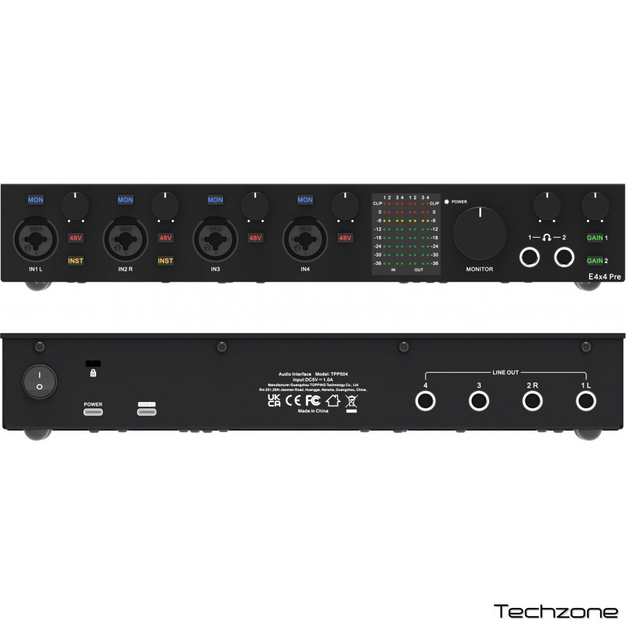Topping E4x4 PRE оснащений чотирма надлінійними мікрофонними модулями власної розробки з рівнем шуму всього -130.5 dBu. Навіть при максимальному рівні гучності інтерфейс зберігає наднизький шумовий поріг, гарантуючи, що кожна деталь запису буде точно відтворена. Така архітектура забезпечує надзвичайно чисту й прозору передачу аудіосигналу.