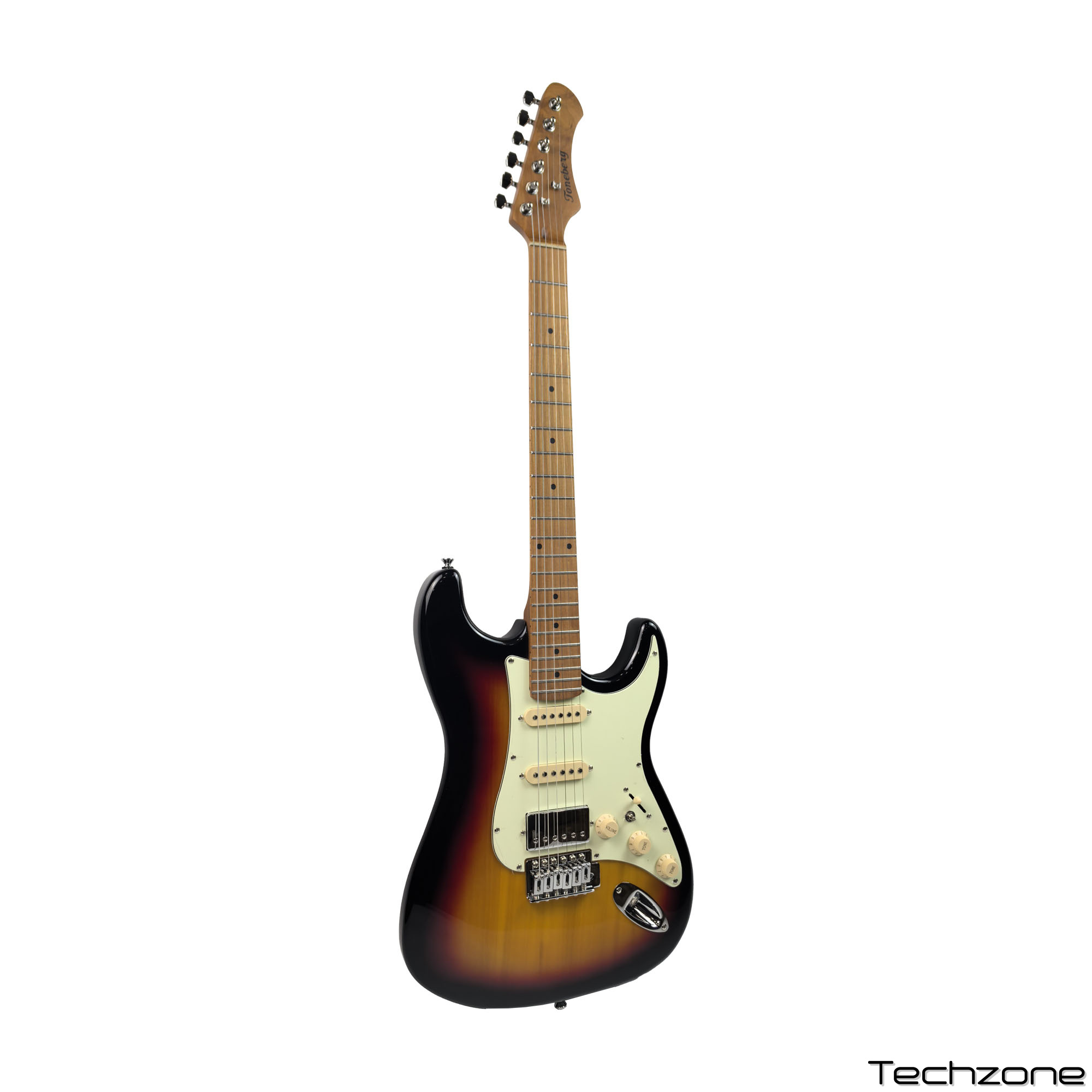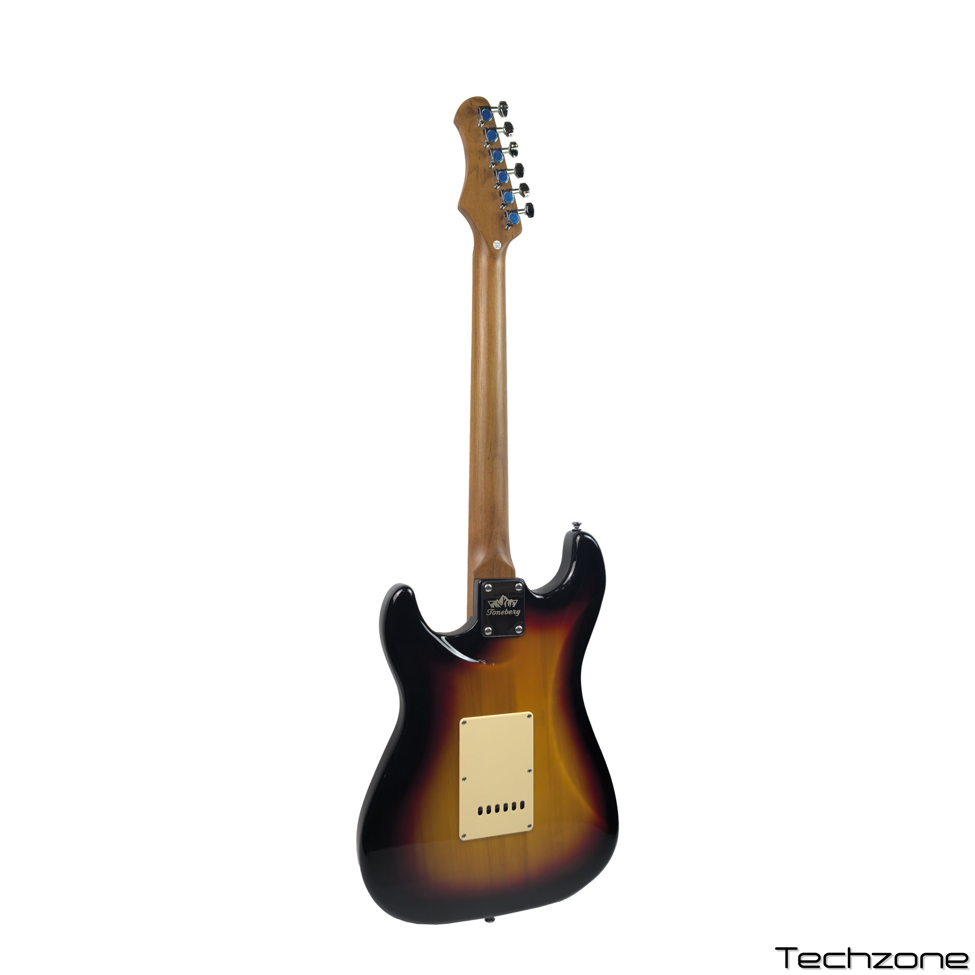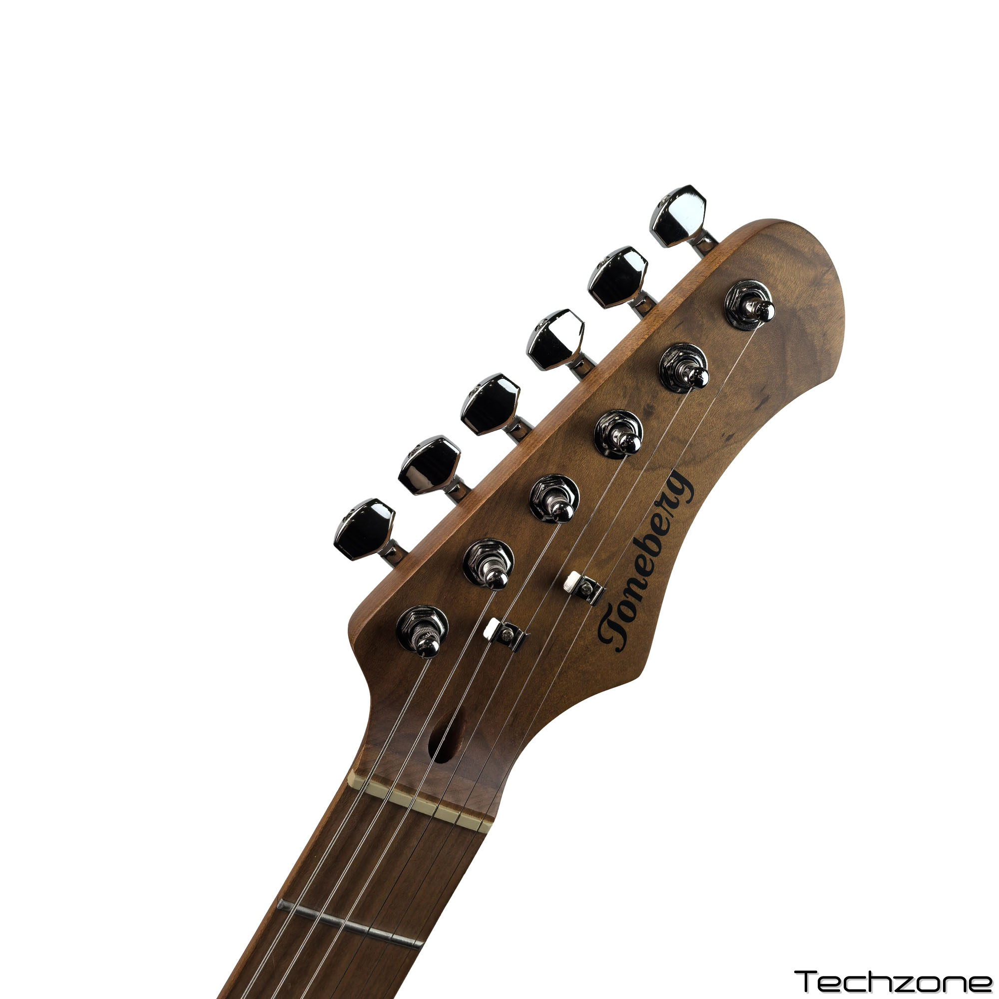Технічні характеристики Модель: Toneberg TEST-600 Форма: Stratocaster Покриття: Глянцеве Корпус: Тополя Гриф: Термооброблений клен (Roasted Maple) Накладка грифа: Термооброблений клен (Roasted Maple) Кількість ладів: 22 Звукознімачі: S-S-H Бридж: Тремоло Струни: Пластик-сталь Регулятори: 1 гучність, 2 тони Перемикачі: 5-позиційний перемикач звукознімачів, міні-перемикач (S/H) ×1 Фурнітура: Хромована, повністю закрита Колір: sunburst Профіль грифа: C