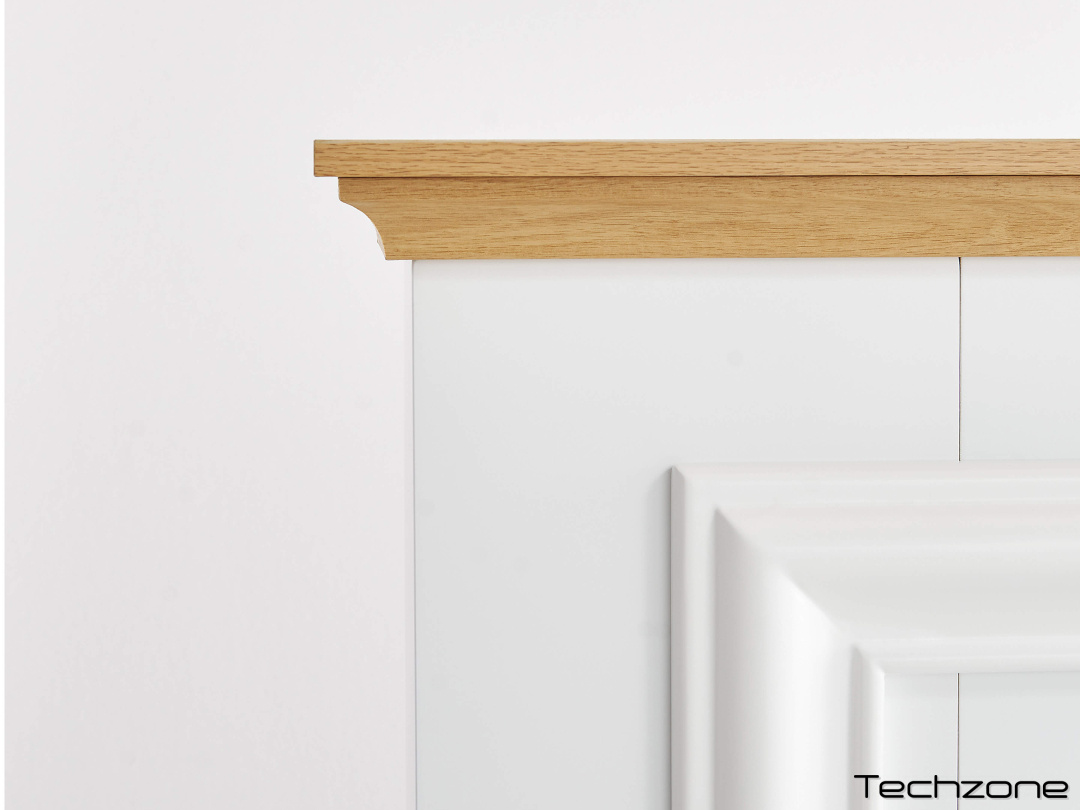 Матеріал камінного порталу – МДФ – здатний витримувати не лише значні перепади температур і підвищену вологість, але й більш стійкий до навантажень, ніж аналоги з цільної деревини. Портал покритий декількома шарами фарби та лаку.