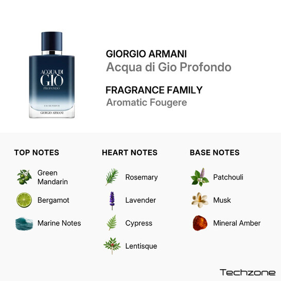 У верхній частині Acqua di Gio Profondo відкривається яскравим сплеском зеленого мандарина та бергамоту в поєднанні з бадьорими морськими нотами, що пробуджують почуття. Коли аромат заспокоюється, у серці розкриваються ароматний розмарин, заспокійлива лаванда, землистий кипарис та сочевиця, що підкреслюють чисту, трав'янисту глибину. Нарешті, база затримується на насиченому пачулі, теплому мускусі та мінеральній амбрі, створюючи тривале враження, яке відчувається одночасно свіжим та приземленим.