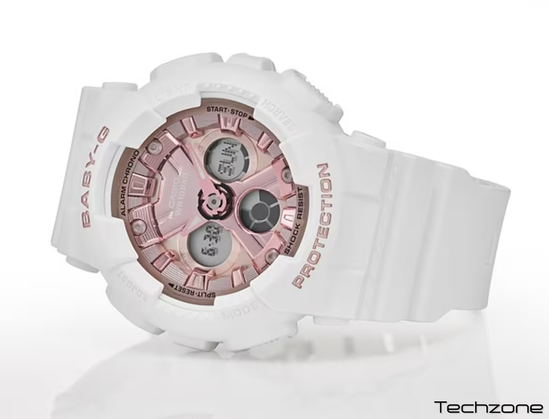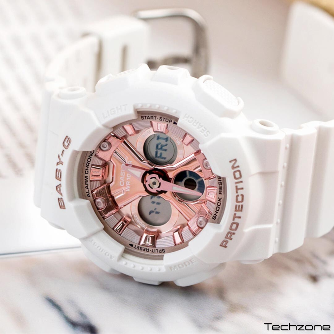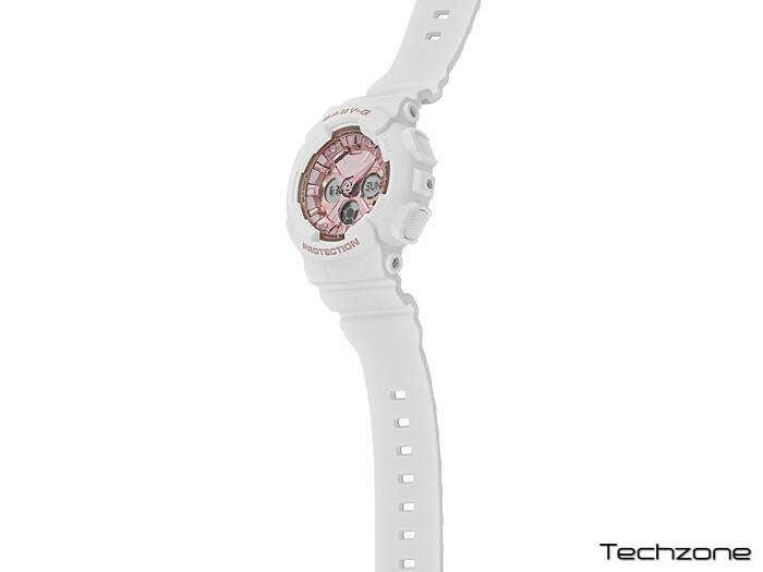 Годинник працює завдяки кварцовому механізму, який живиться від батарейки. Корпус виконаний із пластику кольору рожевого золота, дуже легкого та стійкого до невеликих подряпин і ударів. Ремінець виготовлений з якісного силікону білого кольору. Ремінець ідеально поєднується з іншими частинами годинника. Циферблат із рожевого золота захищений від ушкоджень, оскільки годинник оснащений надійним мінеральним склом, стійким до ударів і подряпин. Перевагою Casio Baby-G Urban є висока водонепроникність 100 метрів, що дає змогу користувачеві носити годинник під час плавання.