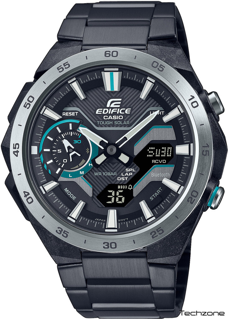 Відчуйте чистий порив боліда, що мчить трасою, з EDIFICE WINDFLOW ECB-2200DD - комбінованим аналогово-цифровим хронографом, натхненним гоночною трасою. Вид збоку, що створює відчуття вітру, який обтікає крило понтонованого боліда формули, і гострий, розмірений циферблат механічної частини створюють неповторний образ величезної швидкості. Корпус із карбону надає годиннику міцності, але зберігає його легкість, що робить його дуже зручним для носіння. Годинник легко синхронізується зі смартфоном через Bluetooth®. Зайдіть у застосунок і отримайте доступ до функцій, які так важливі для перегонових команд: автоматичне коригування точного часу з точністю до секунди, зручне керування світовим часом, передавання даних секундоміра з точністю до мілісекунди для 200 кіл на смартфон, а також підсвітка аналогового циферблата за допомогою Super Illuminator. Система Tough Solar дає змогу заряджати годинник від сонячного світла або навіть від світла люмінесцентної лампи, запасу енергії вистачає на 7 місяців нормальної роботи. Ремінець має чорне іонне покриття для захисту від подряпин.