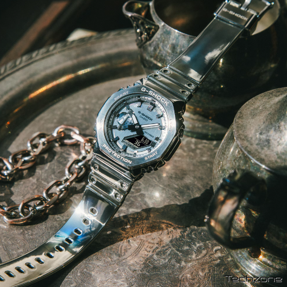 Сміливість G-STEEL поєднується з вишуканим блиском у монохроматичній срібній колірній гамі. Монохромна естетика поєднує металевий безель сріблястого кольору з нещодавно розробленим міцним силіконовим ремінцем того ж кольору. Поверхня ремінця захищена покриттям з полімеру з напиленням срібного кольору, що надає ремінцю металевого мерехтіння і робить його приємним на дотик. М'який і зручний в носінні, з металевим блиском, цей годинник - предмет моди, з яким ви підете куди завгодно. Виберіть свого фаворита - культові GM-2100 з їхнім класичним цифровим стилем.