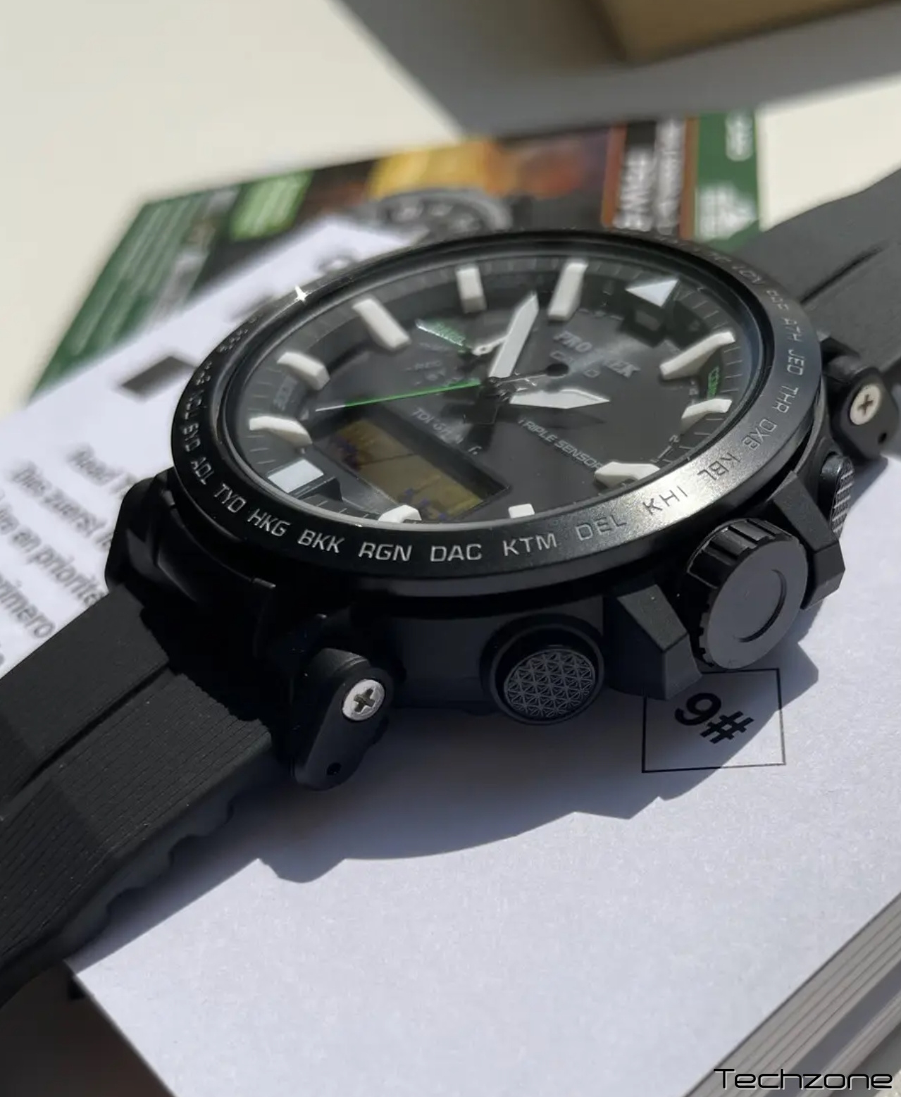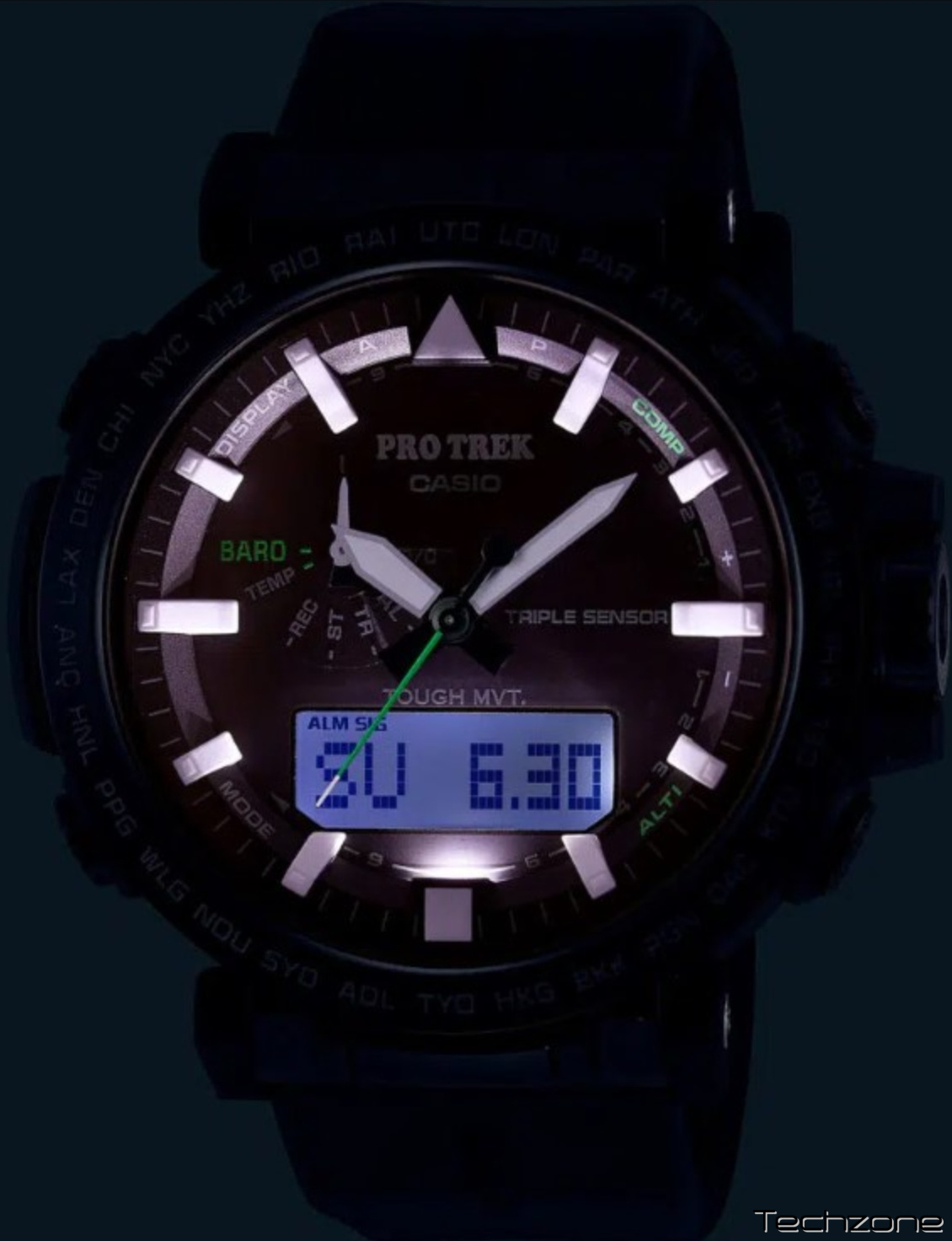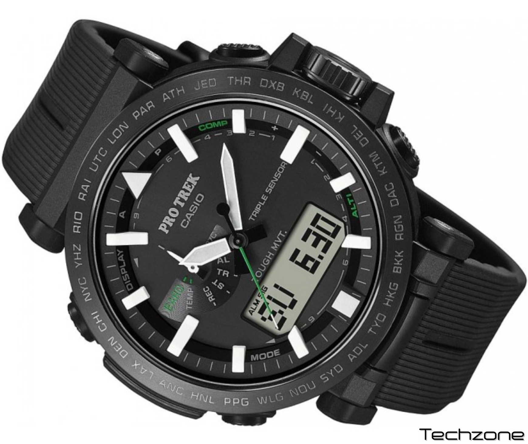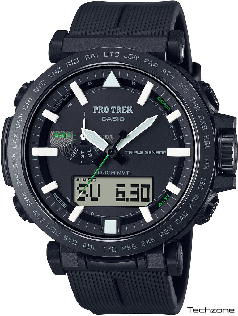 Чоловічий годинник CASIO Pro Trek з кварцовим механізмом і полімерним корпусом у військовому стилі має мінеральне скло, водостійкість 100 WR, чорний циферблат з аналоговою і цифровою індикацією, підсвічування і багатофункціональні можливості. Гарантія 24 місяці.