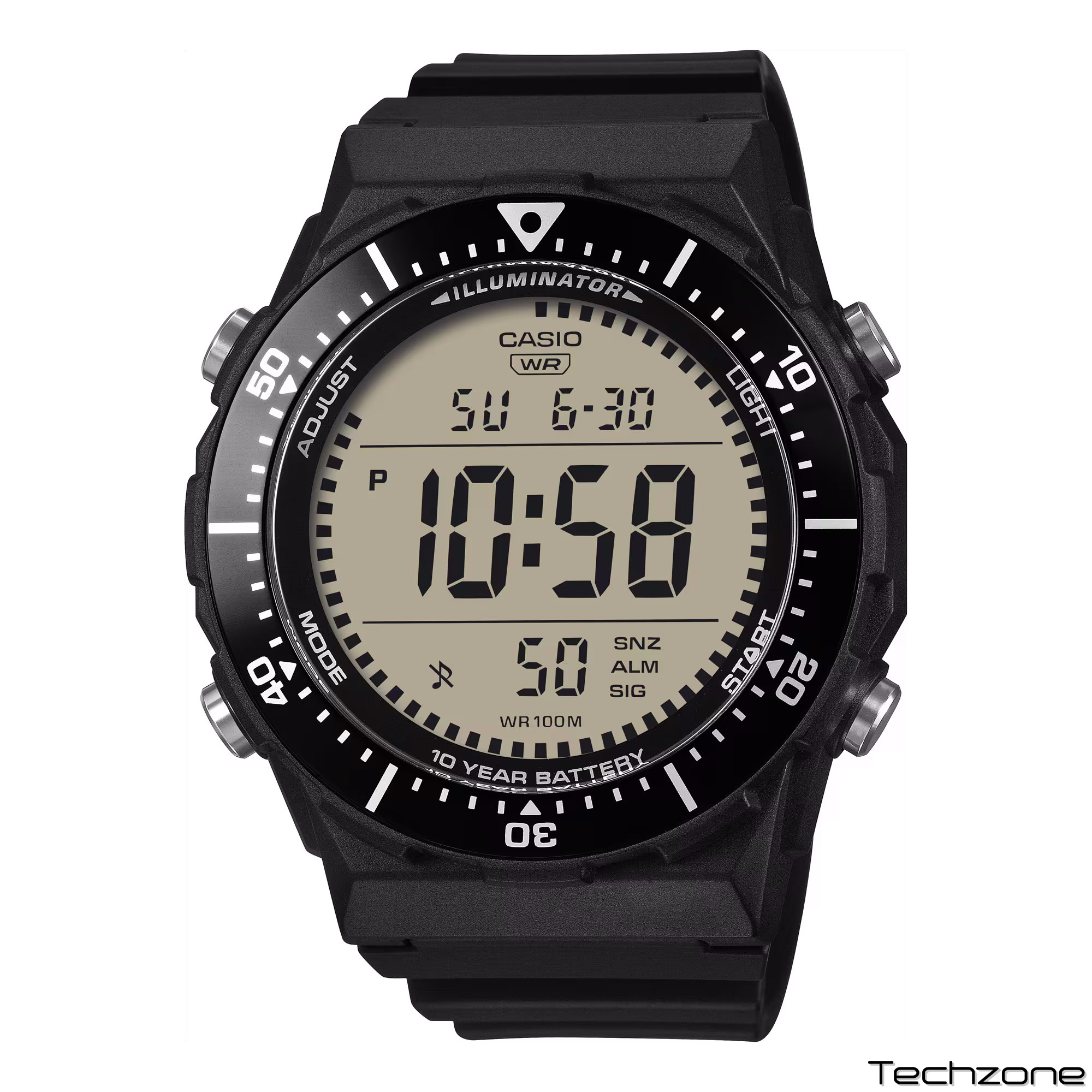 Багатофункціональний цифровий годинник із широким, легкочитабельним дисплеєм та обертовим безелем — ідеально підходить для спорту. Водонепроникність до 10 поділок, десятирічний термін служби батареї, світлодіодне підсвічування, а також зручні функції, такі як секундомір, будильник тощо.
