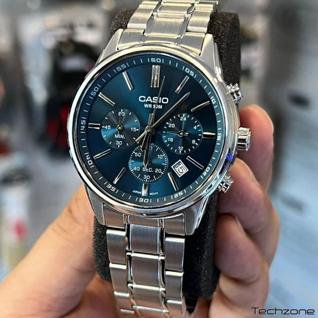 Класний металевий аналоговий годинник зі спортивним дизайном хронографа, який вам подобається, та детальним дисплеєм, який вам потрібен. Три вбудовані циферблати відображають 24-годинний час, секундомір та хвилинний секундомір. Водонепроникність до 50 метрів позбавить вас турбот навіть у дощові дні.