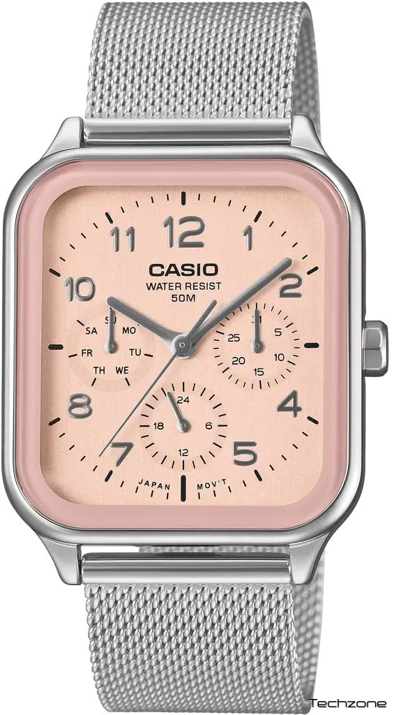 Цей витончений годинник у корпусі з нержавіючої сталі поєднує в собі класичну естетику та щоденну практичність. Завдяки компактним розмірам 44,5 × 34 × 9,4 мм та малій вазі 81 г, модель виглядає вишукано та майже не відчувається на руці. Ремінець з нержавіючої сталі оснащений зручною регульованою застібкою і розрахований на обхват зап'ястя від 150 до 205 мм.