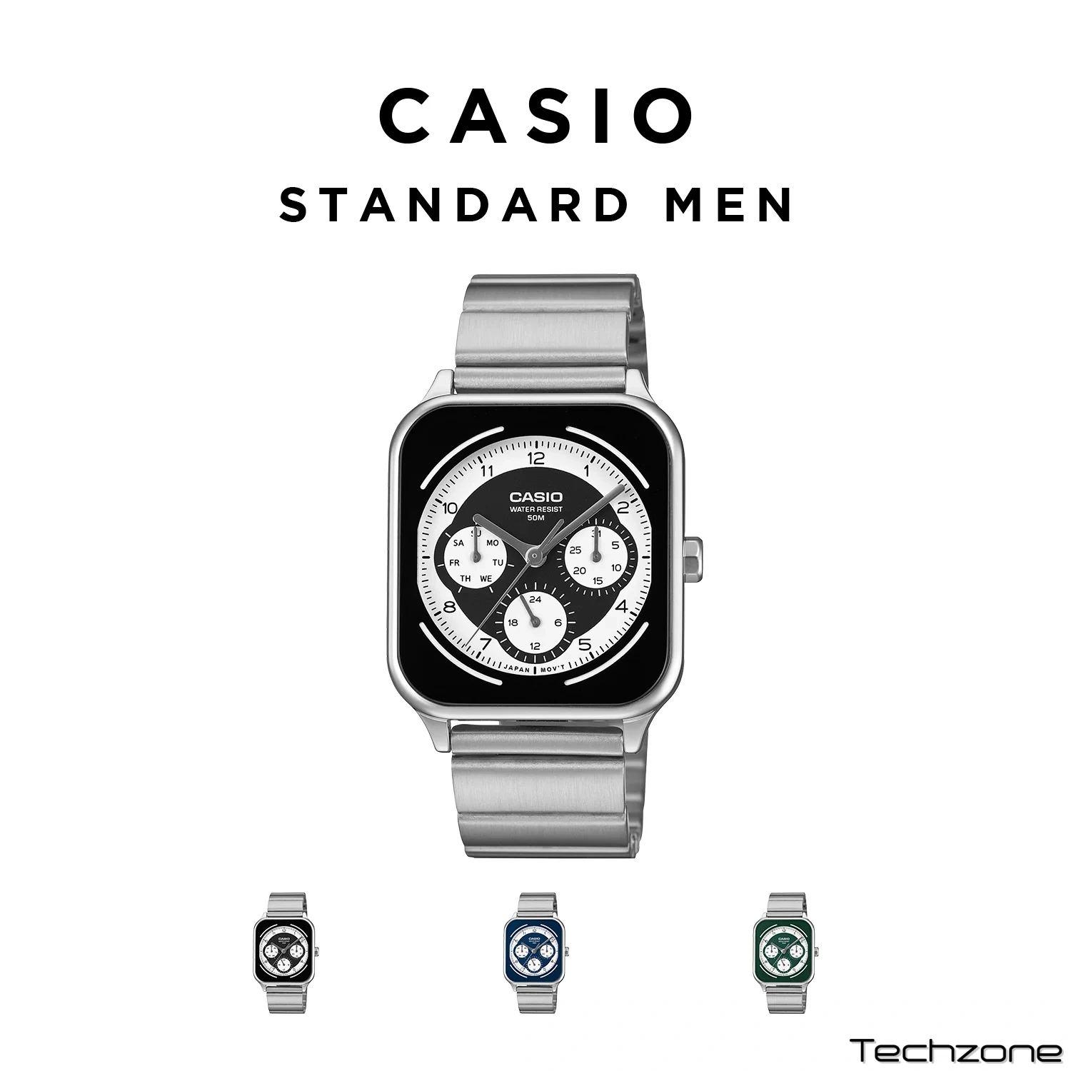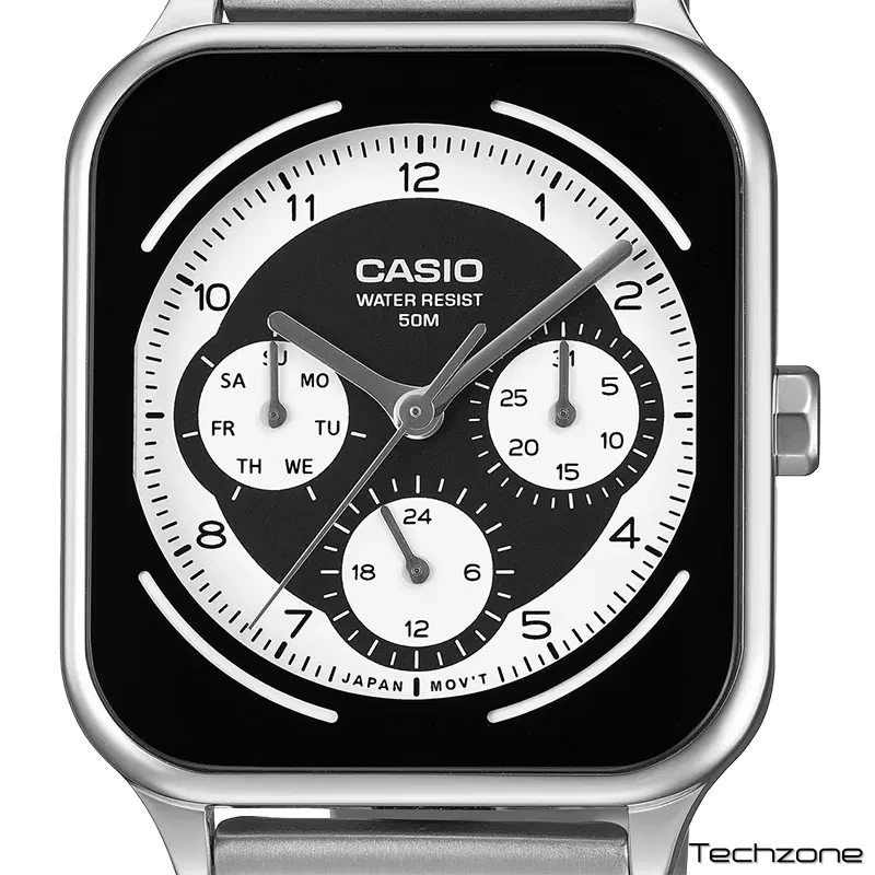 Цей годинник у корпусі з нержавіючої сталі розміром 44,5 × 34 × 9,4 мм є втіленням солідності та надійності, що підкреслюється відчутною вагою у 117 грамів. Сталевий браслет із практичною застібкою в три складання, що відкривається одним дотиком, гарантує комфортне та надійне кріплення на руці з обхватом від 150 до 205 мм. Мінеральне скло захищає інформативний циферблат, де крім основного часу відображаються дата, день тижня та 24-годинний формат. Завдяки водонепроникності 50 метрів годинник не боїться випадкових контактів з водою, а надійний механізм із точністю ±20 секунд на місяць забезпечує стабільну роботу протягом 2 років на одному заряді батареї.