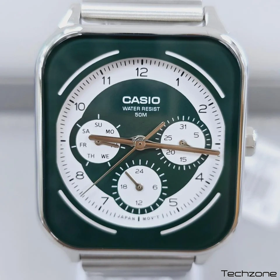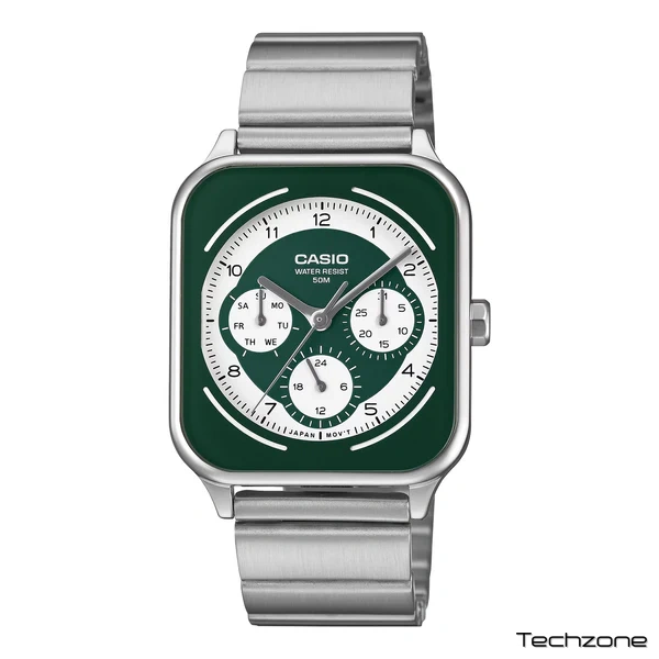Цей годинник у корпусі з нержавіючої сталі розміром 44,5 × 34 × 9,4 мм є втіленням солідності та надійності, що підкреслюється відчутною вагою у 117 грамів. Сталевий браслет із практичною застібкою в три складання, що відкривається одним дотиком, гарантує комфортне та надійне кріплення на руці з обхватом від 150 до 205 мм. Мінеральне скло захищає інформативний циферблат, де крім основного часу відображаються дата, день тижня та 24-годинний формат. Завдяки водонепроникності 50 метрів годинник не боїться випадкових контактів з водою, а надійний механізм із точністю ±20 секунд на місяць забезпечує стабільну роботу протягом 2 років на одному заряді батареї.