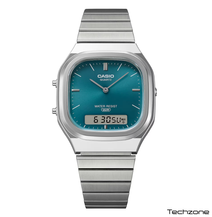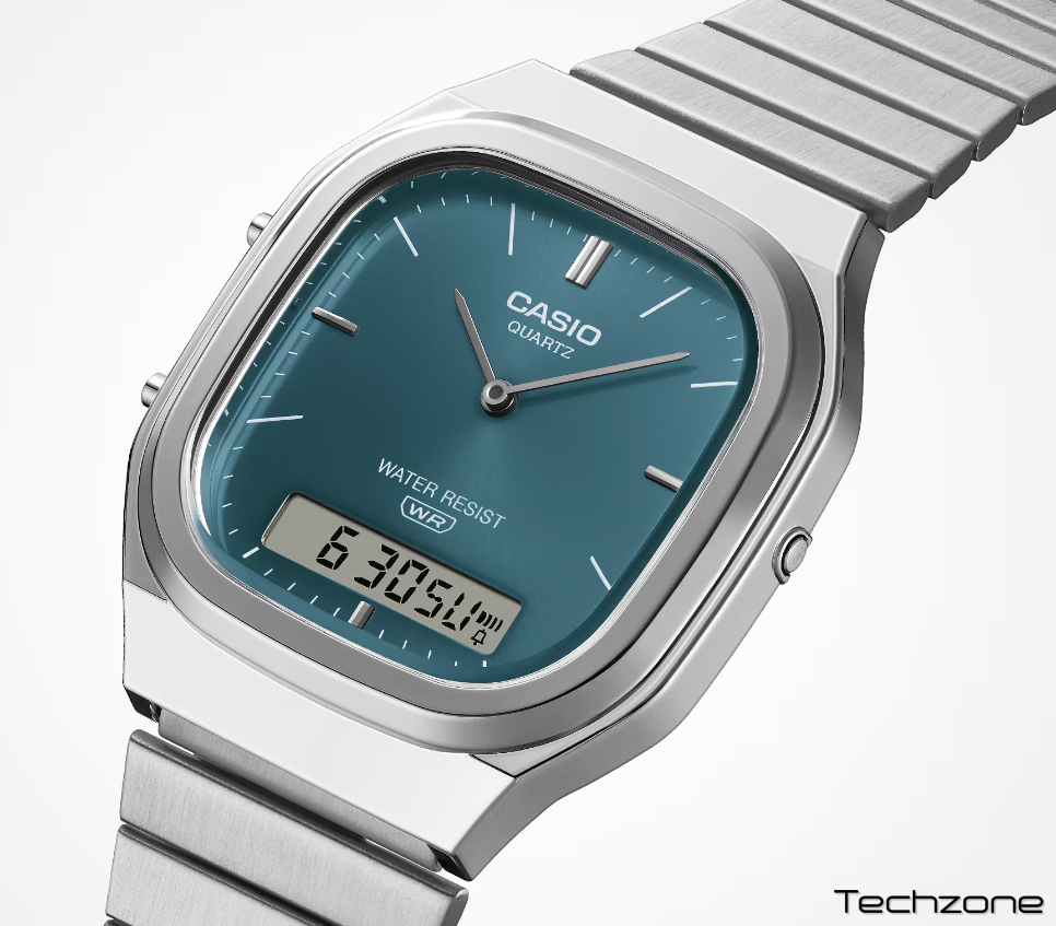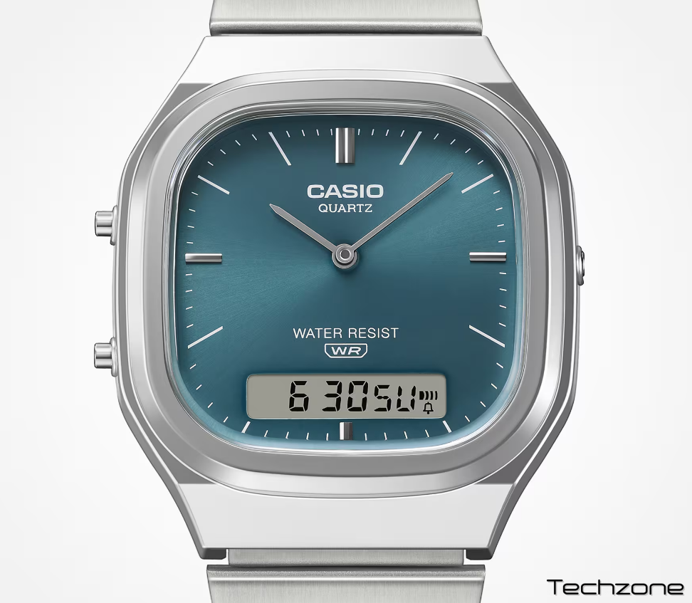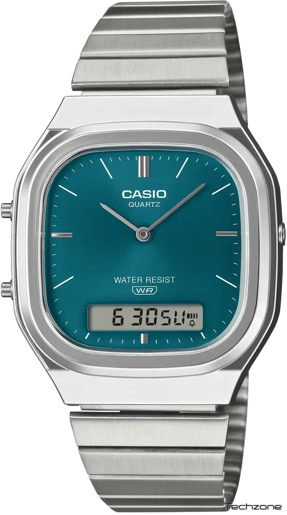 Додайте своєму ретро-стилю сучасного відтінку, а сучасній моді — вінтажного. У будь-якому випадку, вишуканий та стрункий AQ-240E зачіпає саме те, що потрібно. Аналогово-цифровий AQ-240 з подвійним дисплеєм перетворюється на ретромодерн. Зі злегка прямокутним циферблатом, згладженим м’яко заокругленим корпусом та м’якими металевими вигинами, цей годинник випромінює вишуканість. Сонячне покриття циферблата відбиває світло блискучим сяйвом. Металеві індекси, що поєднують вінтажний стиль із сучасною естетикою, додають ще один привабливий штрих. Цифровий РК-дисплей у положенні «6 годин» забезпечує чудову читабельність, зберігаючи гармонійний загальний дизайн, створюючи годинник, який є одночасно функціональним та красивим.