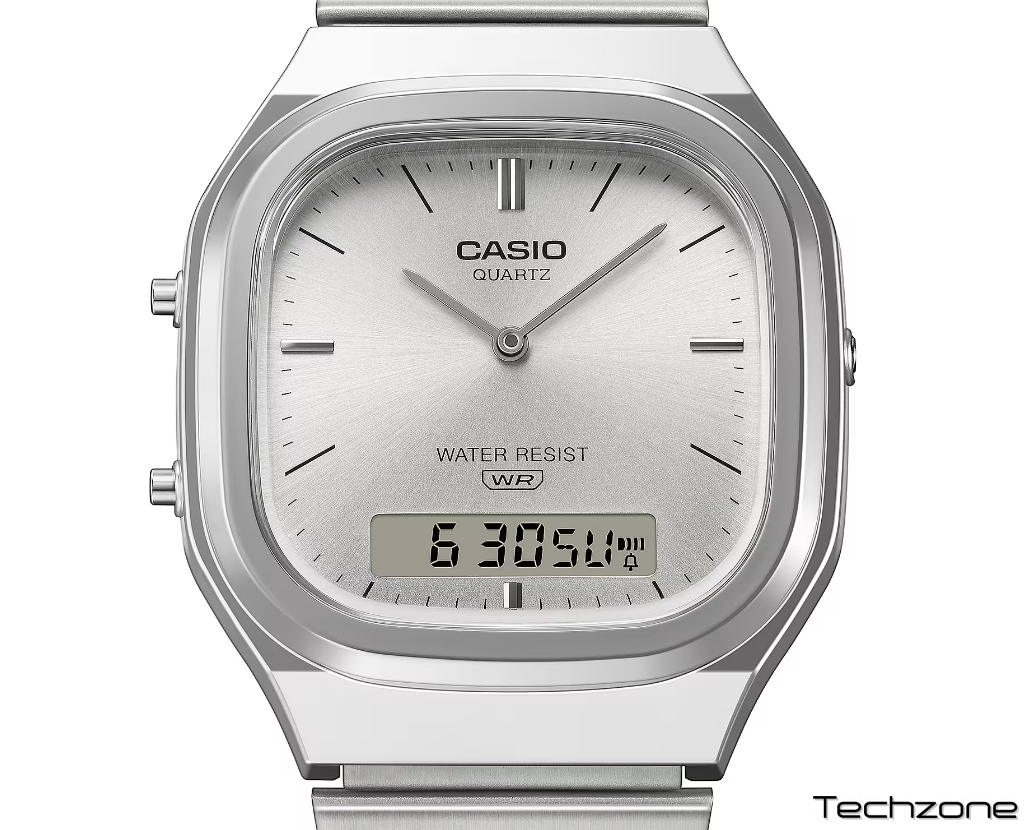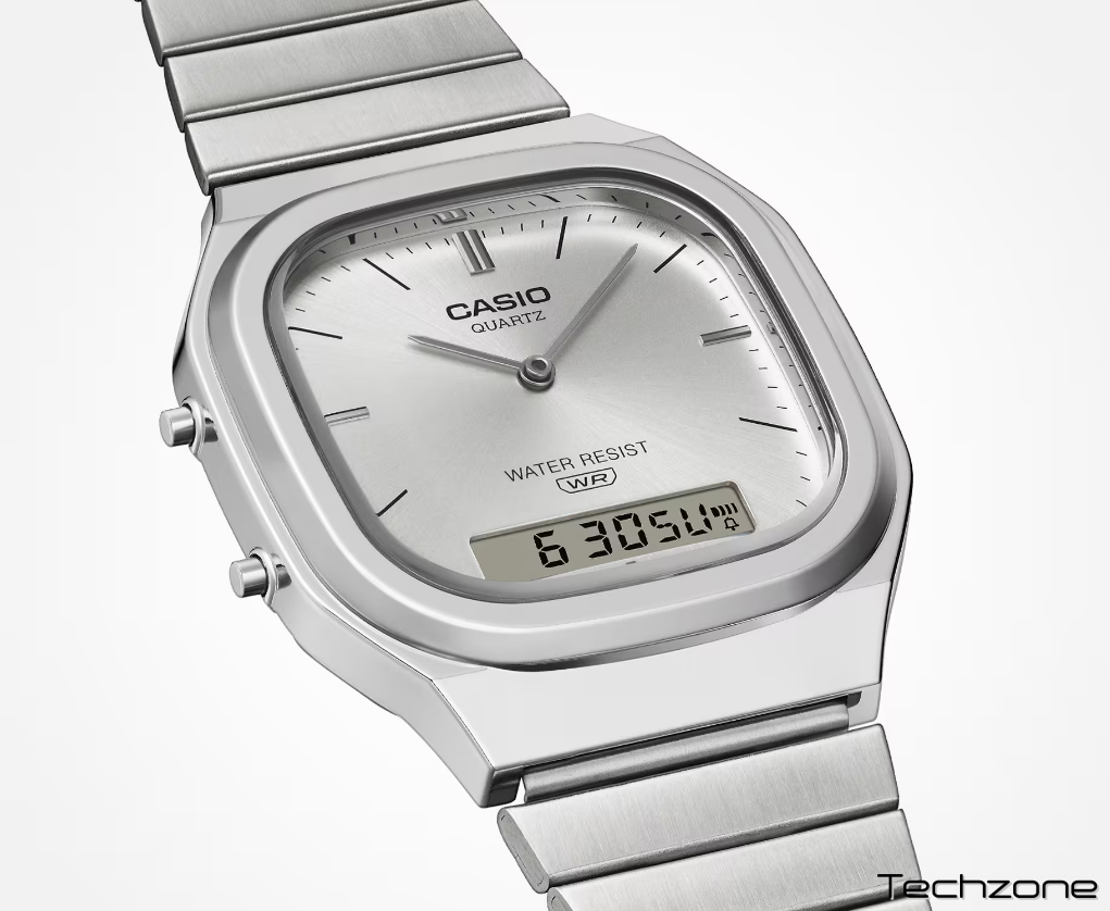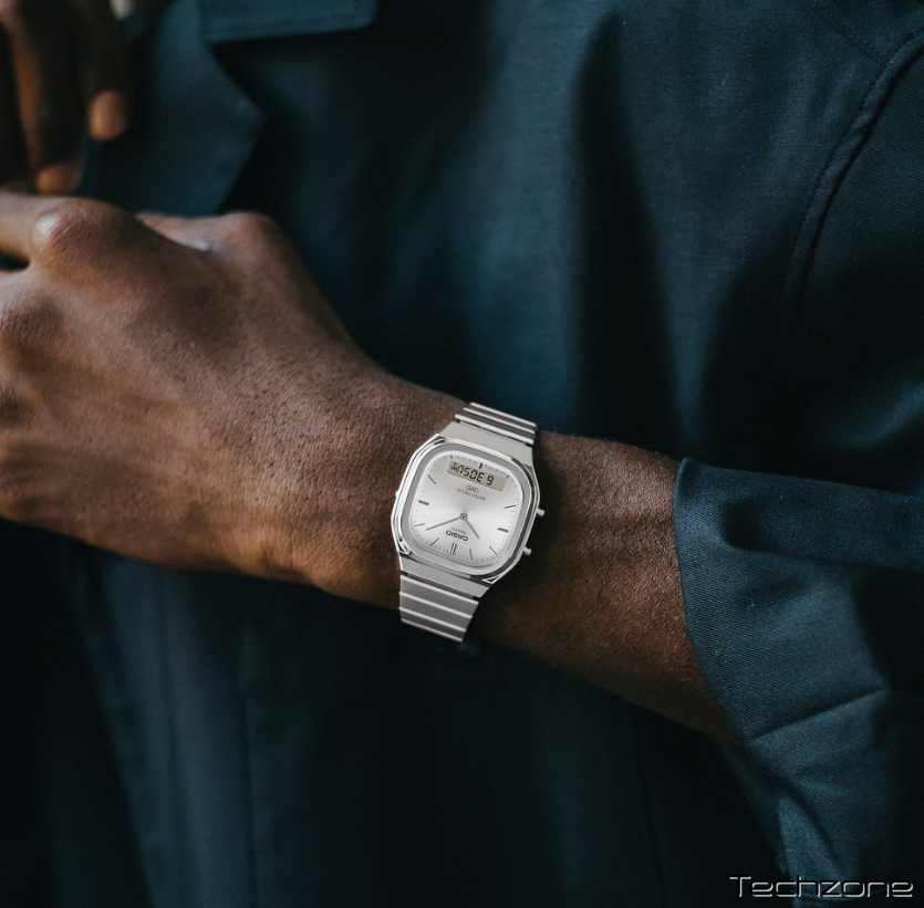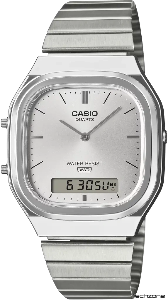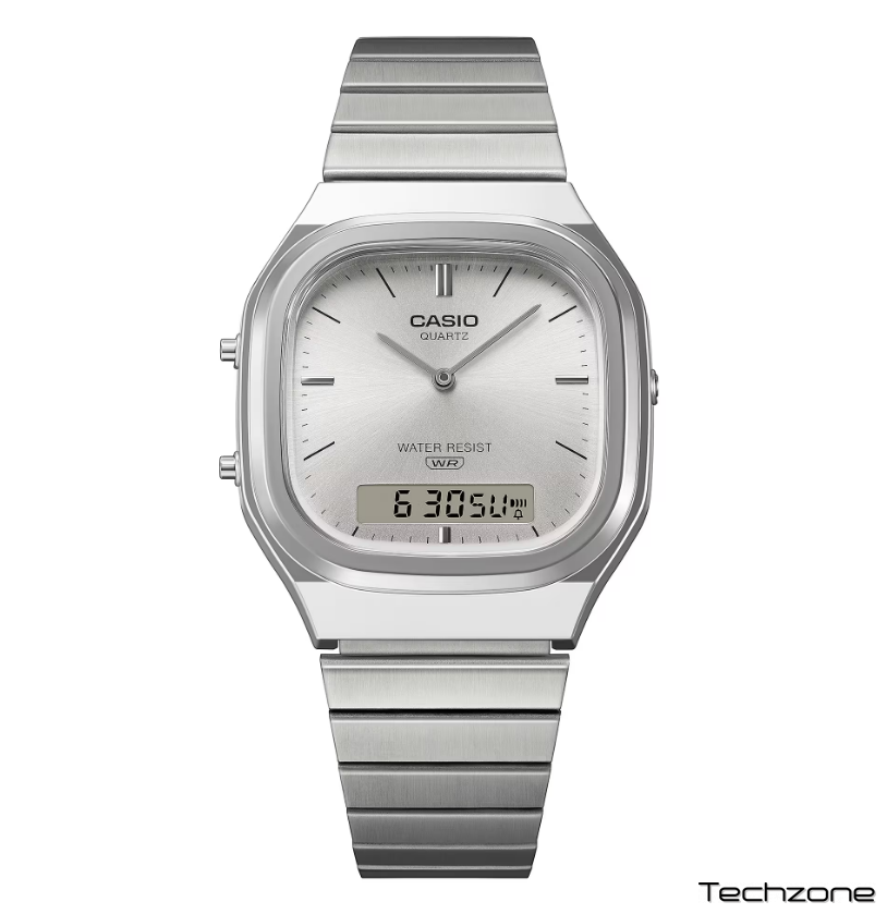 Додайте своєму ретро-стилю сучасного відтінку, а сучасній моді — вінтажного. У будь-якому випадку, вишуканий та стрункий AQ-240E зачіпає саме те, що потрібно. Аналогово-цифровий AQ-240 з подвійним дисплеєм перетворюється на ретромодерн. Зі злегка прямокутним циферблатом, згладженим м’яко заокругленим корпусом та м’якими металевими вигинами, цей годинник випромінює вишуканість. Сонячне покриття циферблата відбиває світло блискучим сяйвом. Металеві індекси, що поєднують вінтажний стиль із сучасною естетикою, додають ще один привабливий штрих. Цифровий РК-дисплей у положенні «6 годин» забезпечує чудову читабельність, зберігаючи гармонійний загальний дизайн, створюючи годинник, який є одночасно функціональним та красивим.