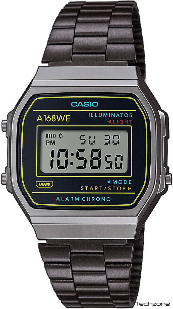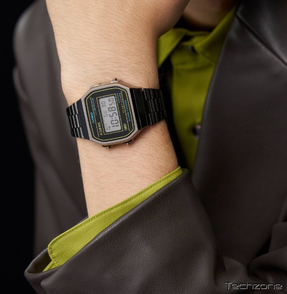 Casio відроджує цей культовий дизайн у формі годинника, привносячи оригінальний штрих 80-х у завжди популярний A168, використовуючи ретро-чорний та золотий базові кольори SL-800, і навіть ті ж акцентні кольори, що використовуються для цифр часу та інших деталей.