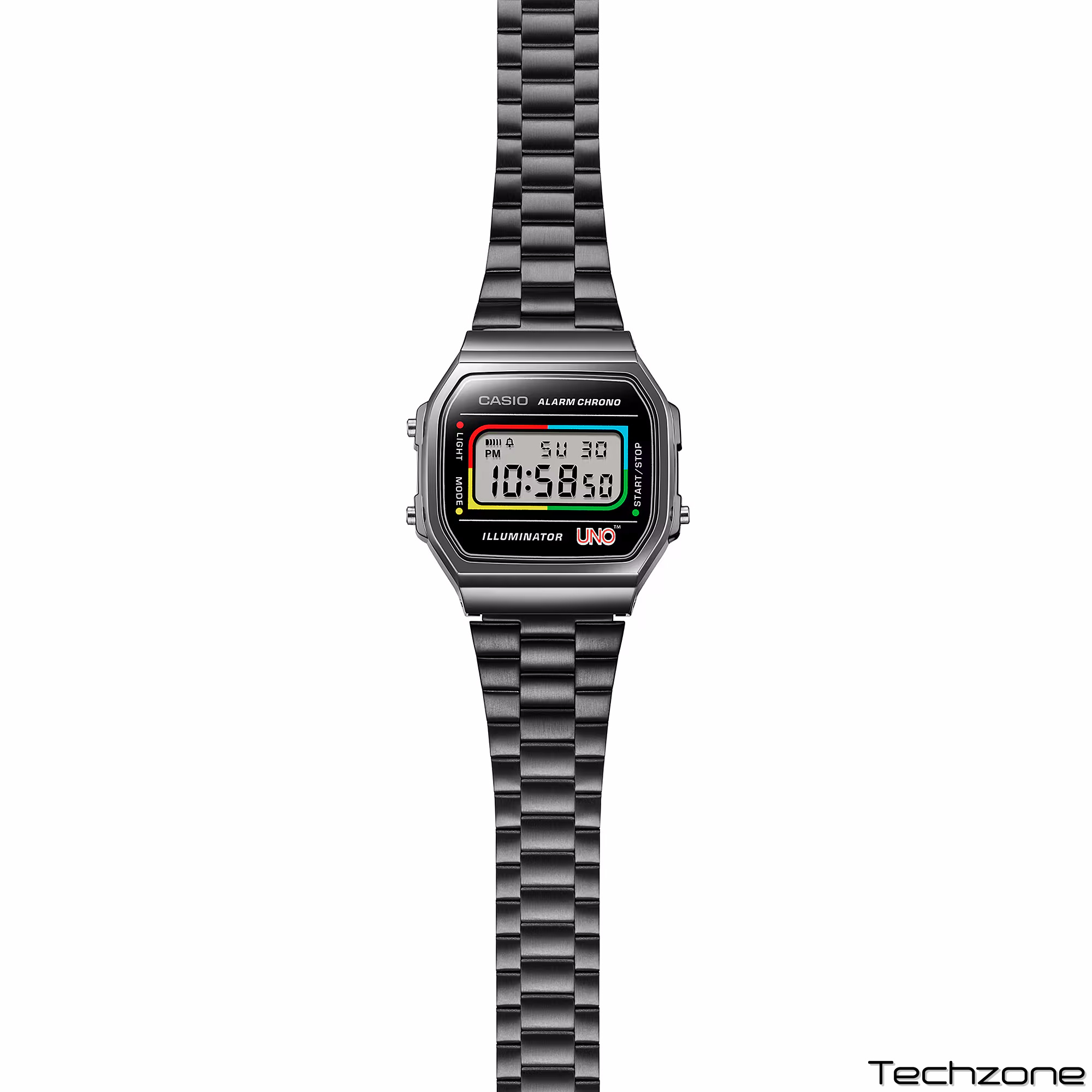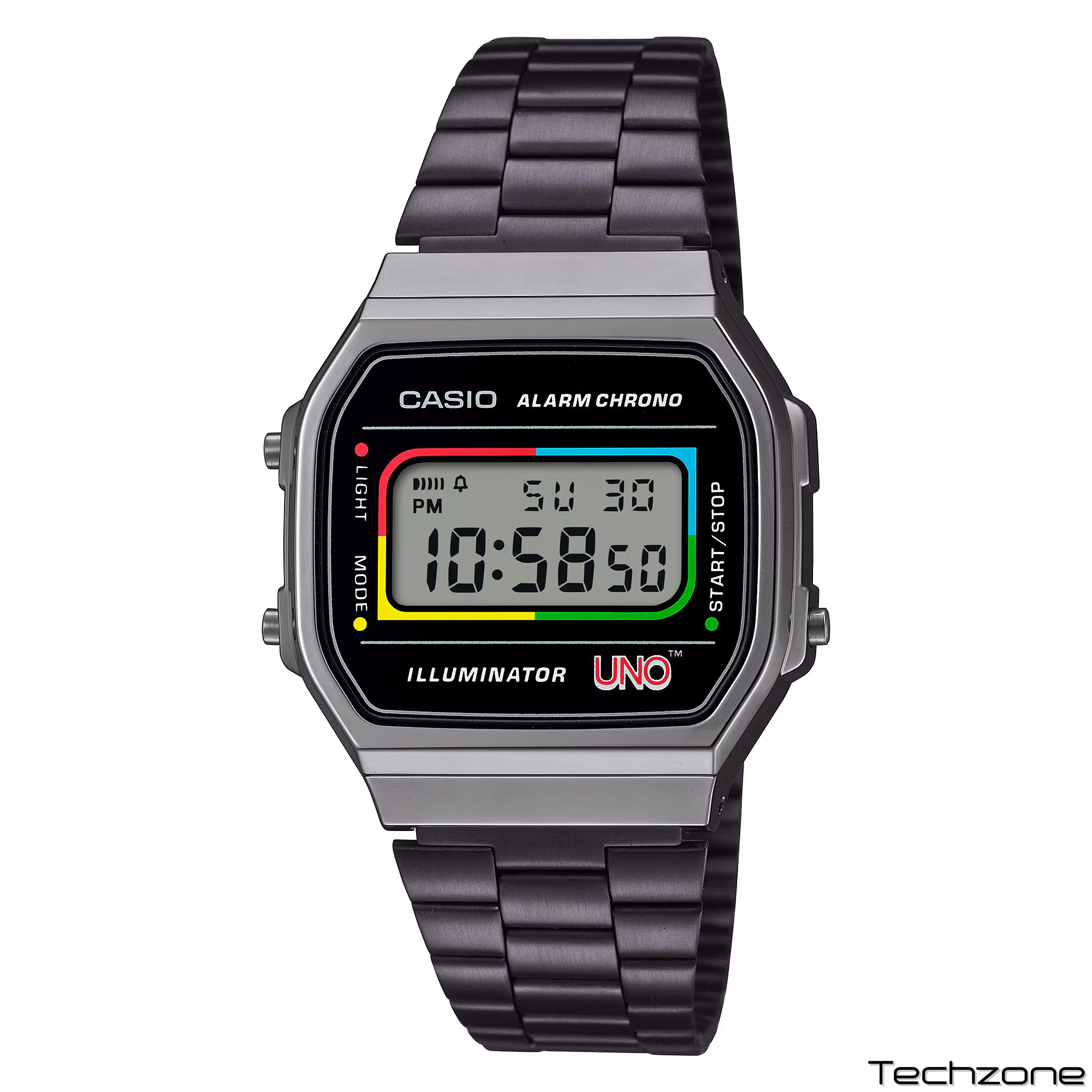 Ця унікальна співпраця починається з популярного вінтажного стилю годинника A168 та містить мотив UNO™, який вшановує класичний дизайн гри 1979 року. Циферблат прикрашений кольорами всемогутньої карти Wild, що дає гравцеві вибір: червоний, синій, жовтий або зелений. Активуйте підсвічування EL та побачите слово «Wild» на РК-дисплеї. Класична тема відображена в оригінальному логотипі UNO™ на циферблаті.