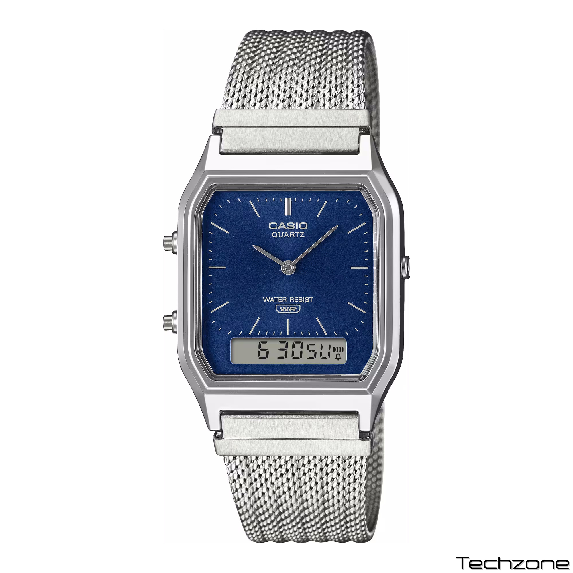 Оновлена версія улюбленої класики — аналогово-цифрова комбінація AQ-230 з кутастим циферблатом стильно поєднується з тонким сітчастим ремінцем.