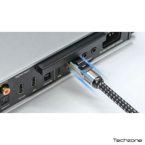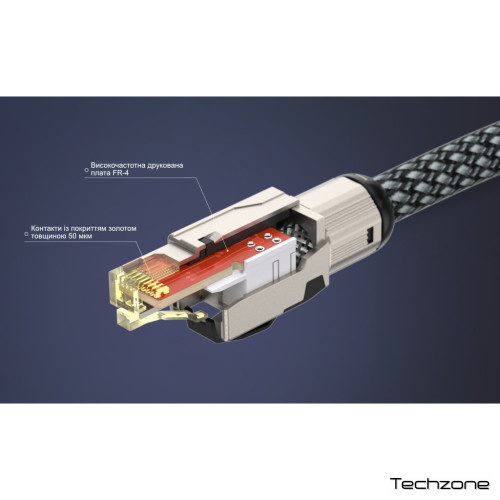 Конектор RJ45 має повністю екрановану металеву оболонку, яка відповідає стандарту швидкості Cat.6A 10 Гбіт/с. Контакти конектора мають золоте покриття товщиною 50 мкм для створення надзвичайно низького опору контактів. Внутрішня плата виготовлена з високочастотного матеріалу FR-4, що забезпечує стабільний хвильовий опір і повністю відповідає вимогам передавання високоякісного аудіопотоку мережею.