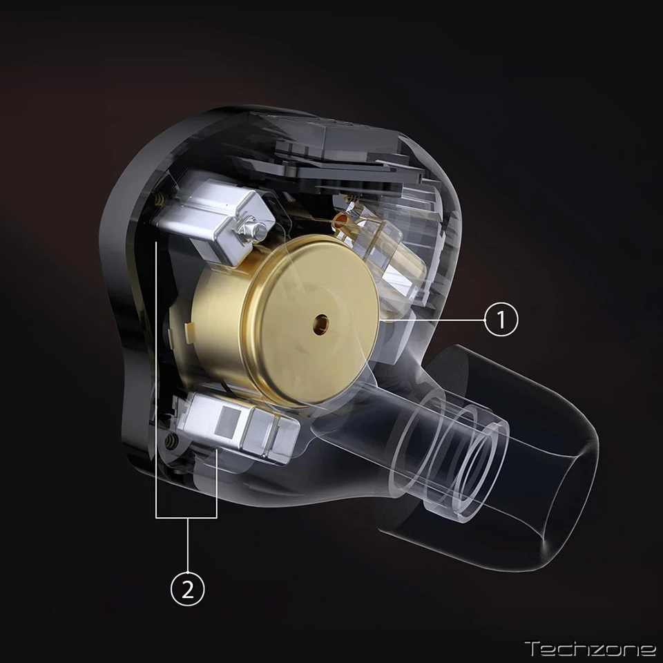 Динамічний драйвер обробляє діапазон середніх та низьких частот, забезпечуючи широку низькочастотну характеристику та природні переходи середньої частоти, щоб покращити динаміку та атмосферу музики. З іншого боку, збалансовані арматурні драйвери чудово працюють у діапазоні високих частот. Їх компактна структура та швидка реакція дозволяють точно відтворювати високочастотні деталі, що призводить до чіткої та прозорої звукової текстури.