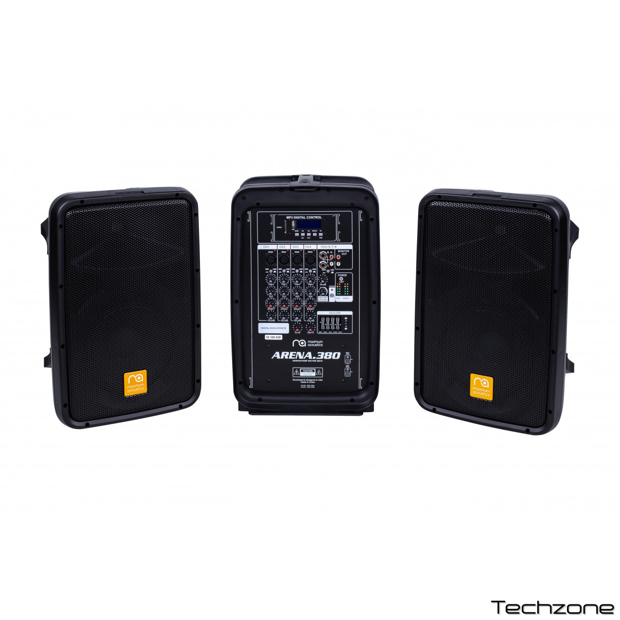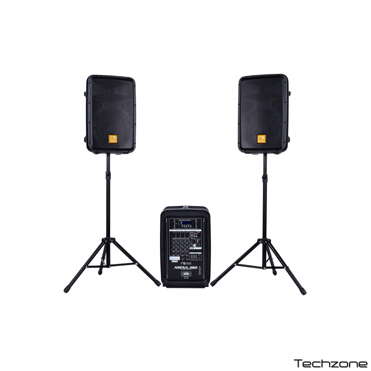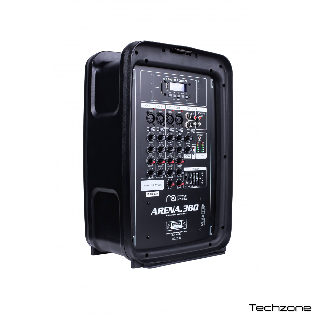 Maximum Acoustics Аrеnа.380 - це універсальний активний комплект гучномовців «Все-в-одному», що складається з двох акустичних систем, 8-канального мікшера із вбудованим підсилювачем, двох стійок та двох дротових мікрофонів. Завдяки багатому функціоналу та широким можливостям підключення Аrеnа.380 ідеально підходить для виступів на сцені, виїзних подій, публічних заходів, ВТL-акцій, а також стаціонарної роботи у клубах, ресторанах, кафе, тощо.