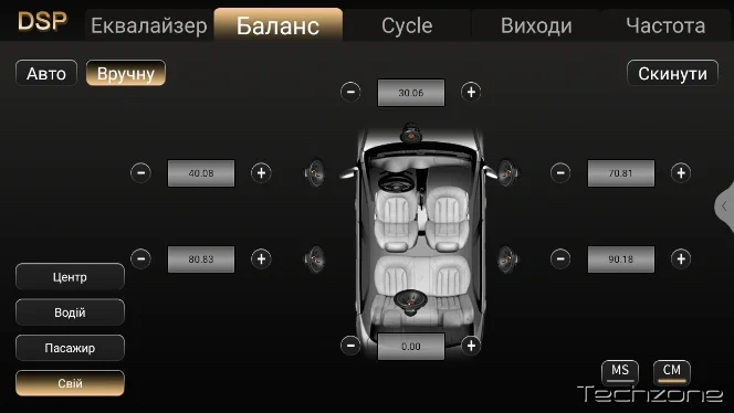 Часові затримки. Одна з найважливіших функцій звукового процесора, що дозволяє налаштувати правильну звукову сцену в автомобілі. Користувачеві доступні 4 варіанти розміщення слухачів у салоні автомобіля. Для більш точного налаштування передбачено ручний режим налаштування часових затримок, де можна виставити точну відстань від динаміка до слухача у сантиметрах або мілісекундах.