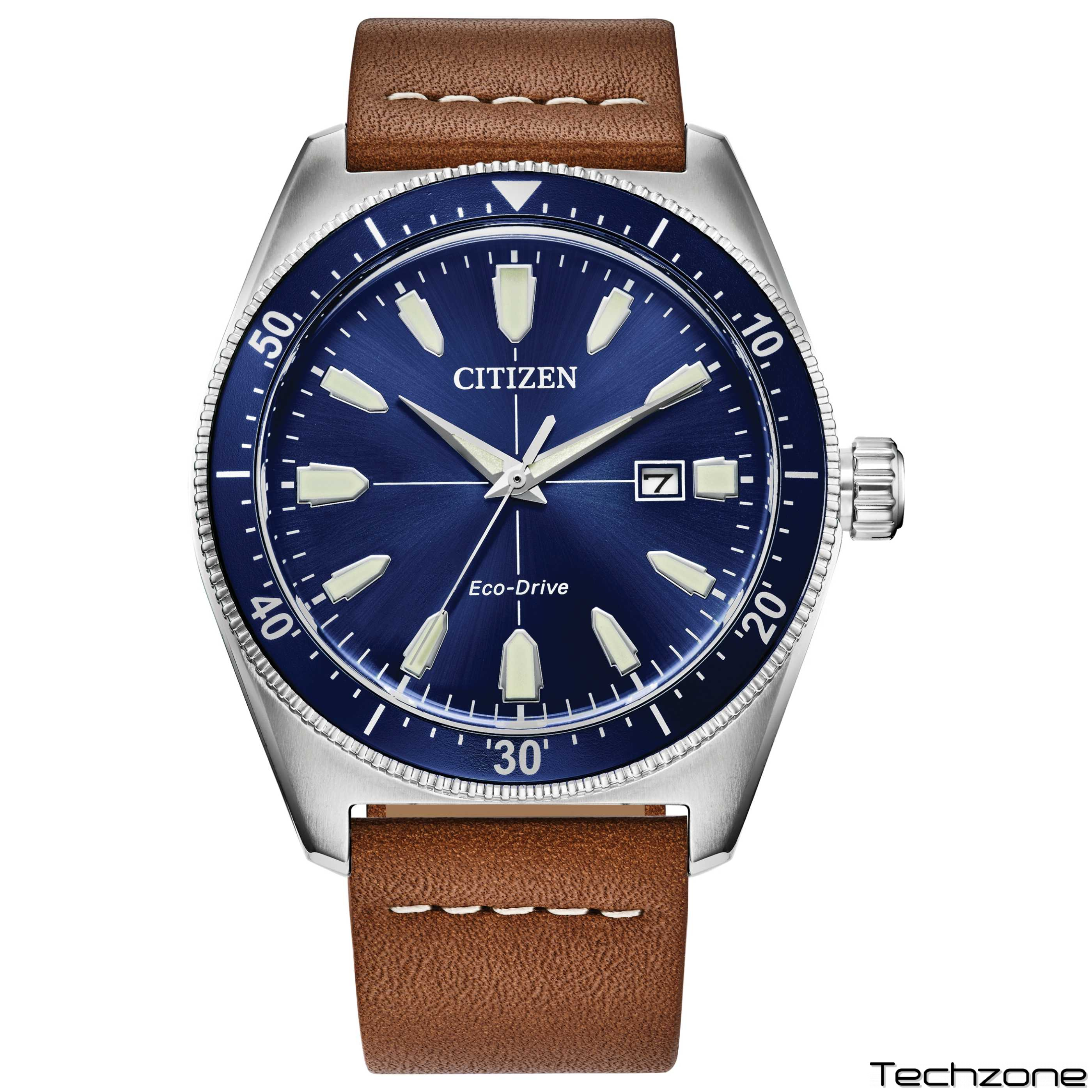Чоловічий спортивно-повсякденний годинник Citizen Eco-Drive Brycen з коричневим шкіряним ремінцем та синім циферблатом, 3-стрілковою датою, люмінесцентним, 43 мм