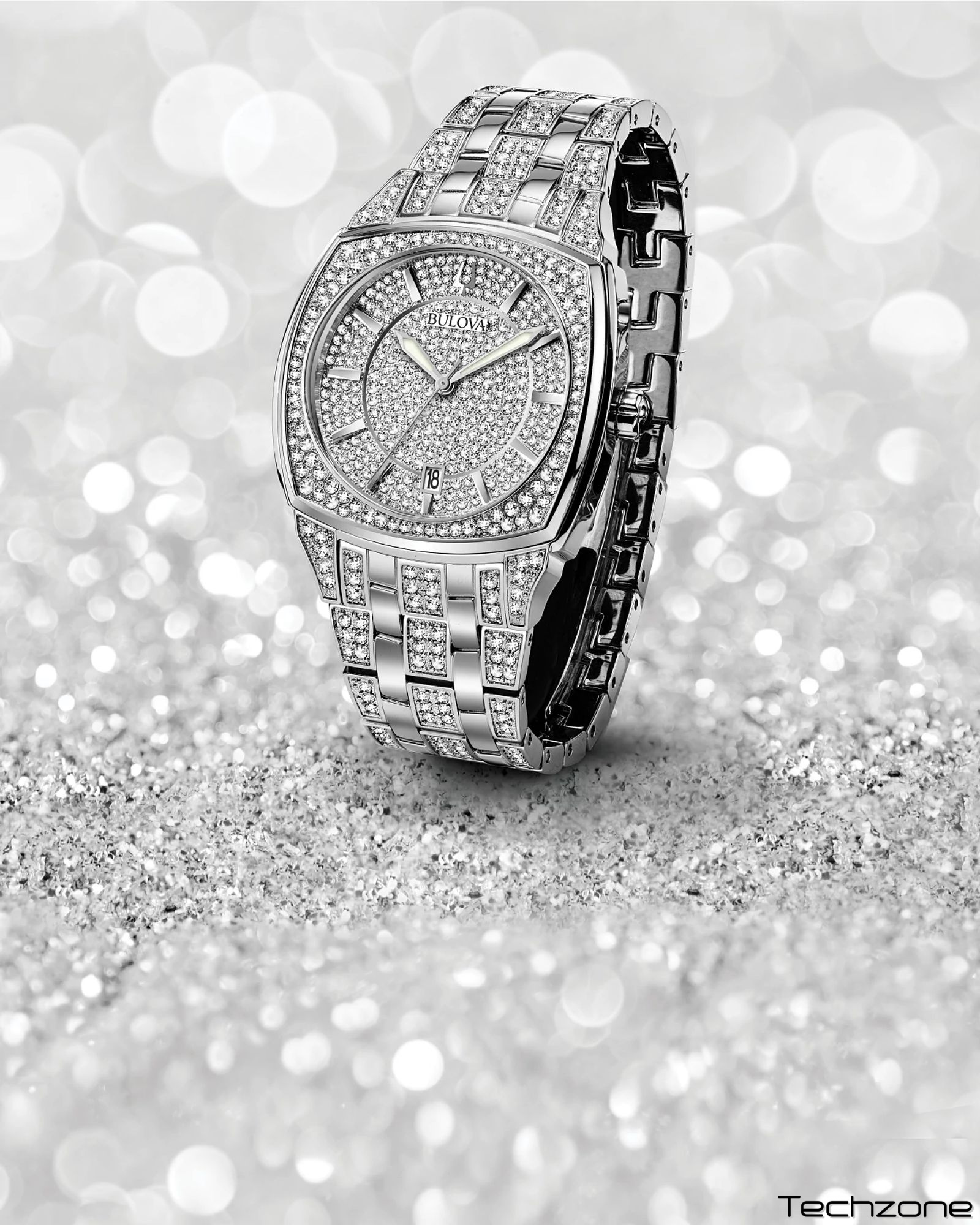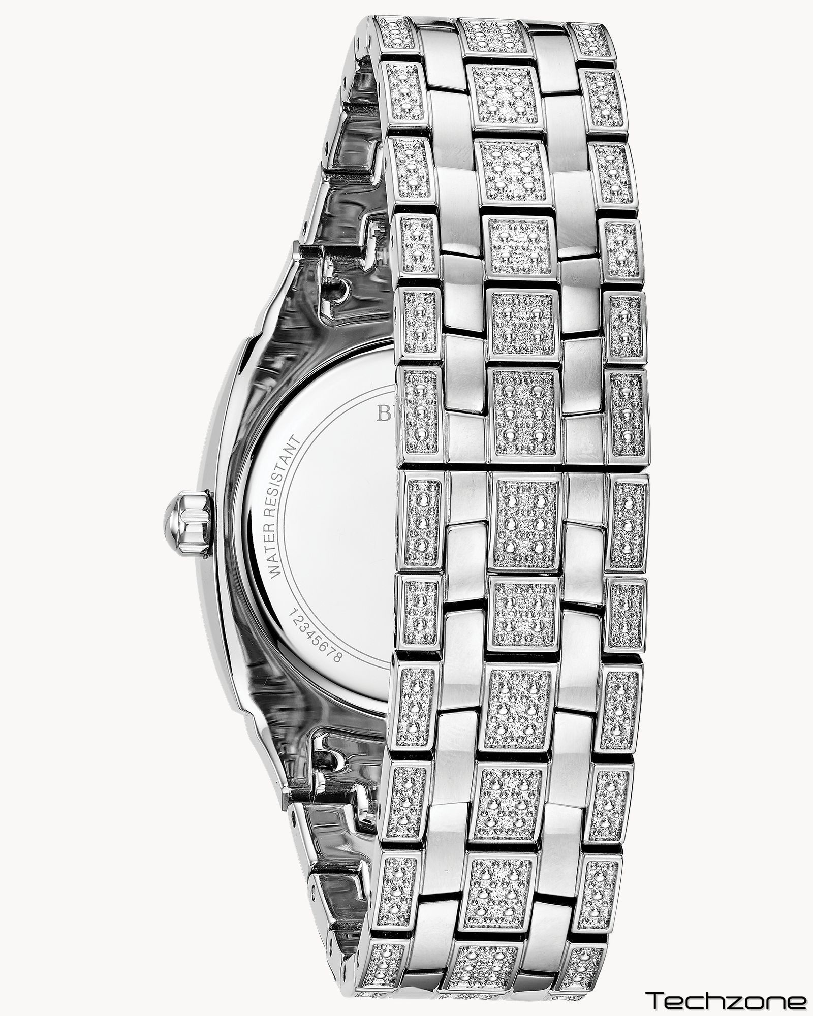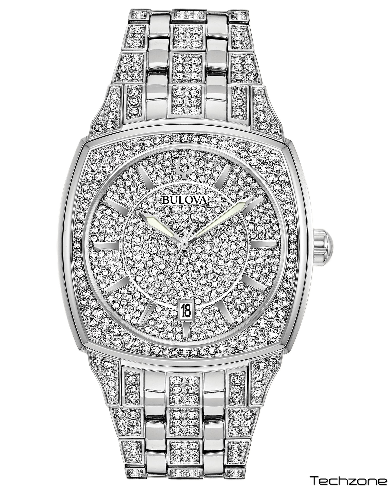 Це розкішний годинник Bulova 96B296 у стилі dress-watch, який вражає своєю інкрустацією та унікальною формою корпусу.