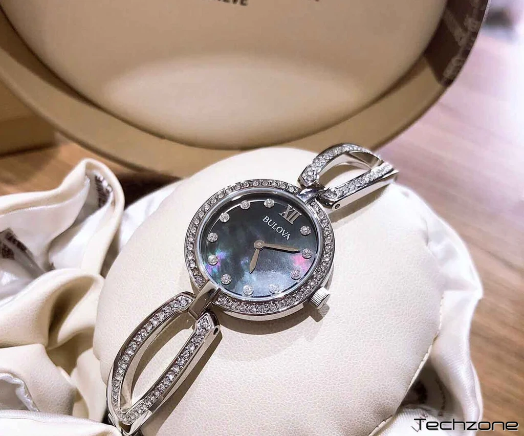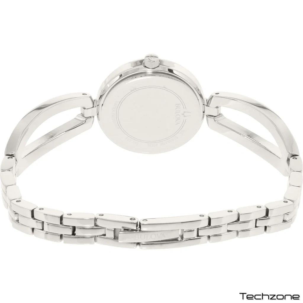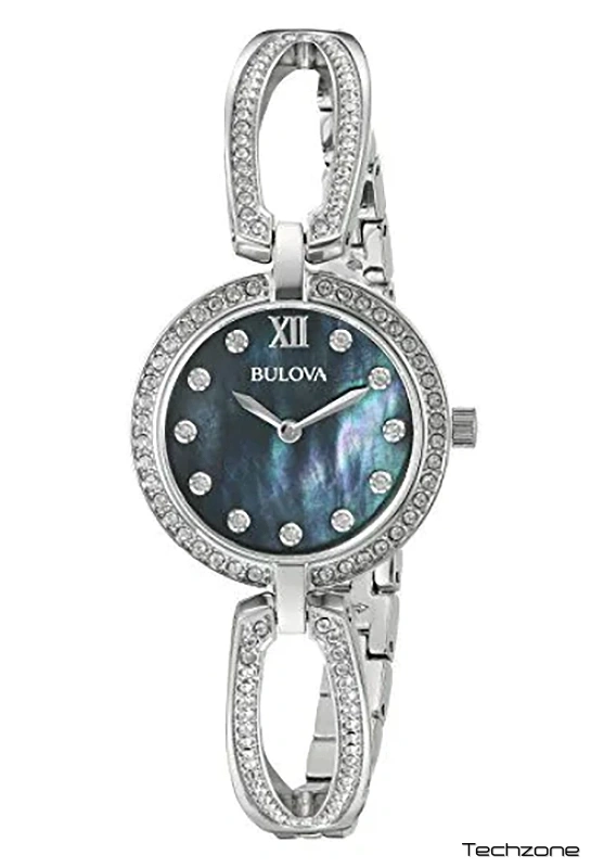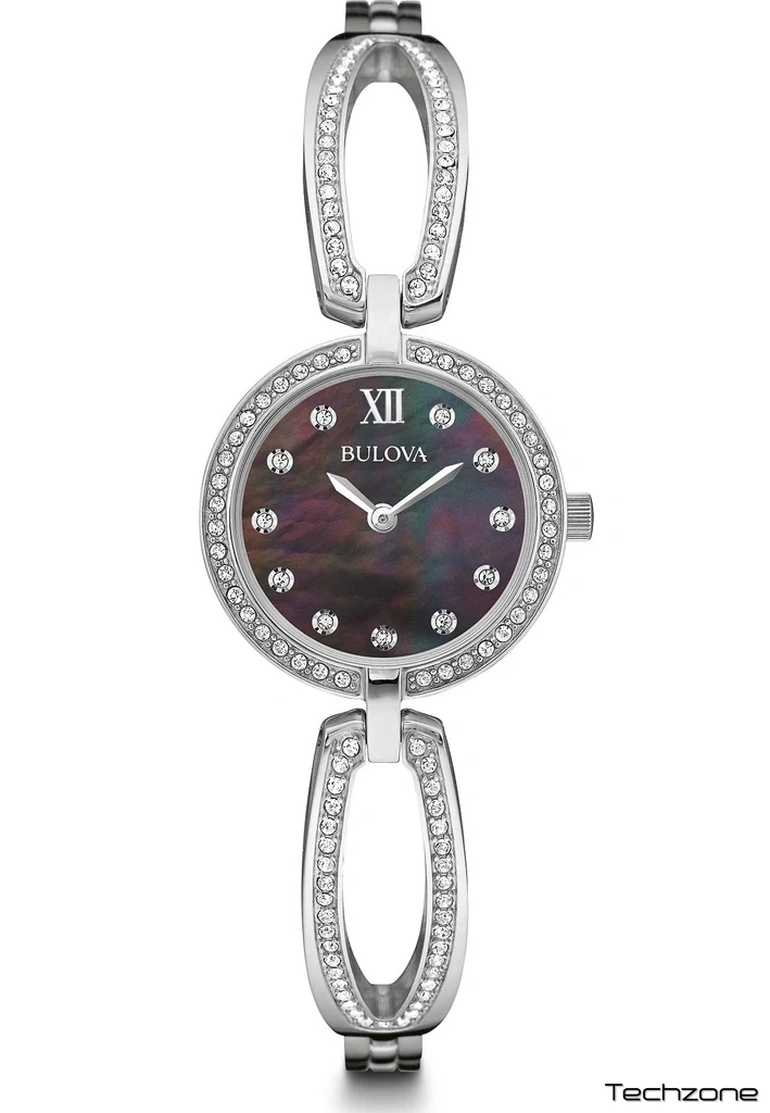Круглий корпус, 26 мм, з безелем, інкрустованим кристалами. Чорний перламутровий циферблат з кришталевими маркерами, сріблястими римськими цифрами, двома стрілками та логотипом Bulova.