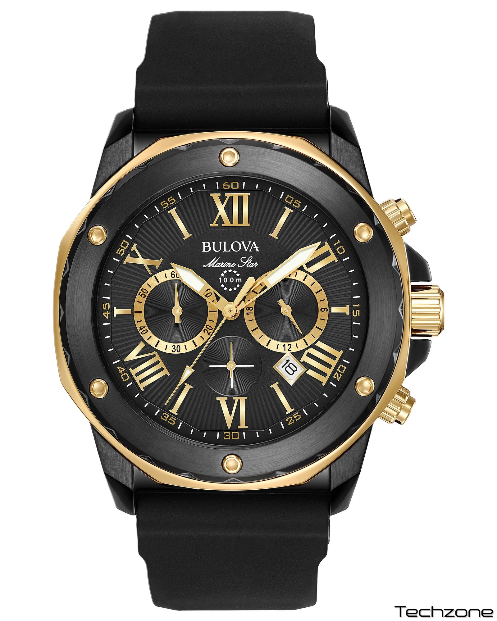 Це потужний чоловічий годинник-хронограф із спортивної колекції Marine Star, що вирізняється ефектним чорно-золотим оформленням та розширеною функціональністю.