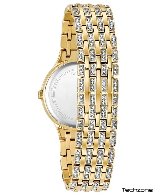 Циферблат: Циферблат типу "паве" (повністю вкритий кристалами) має золотисті стрілки та мітки.