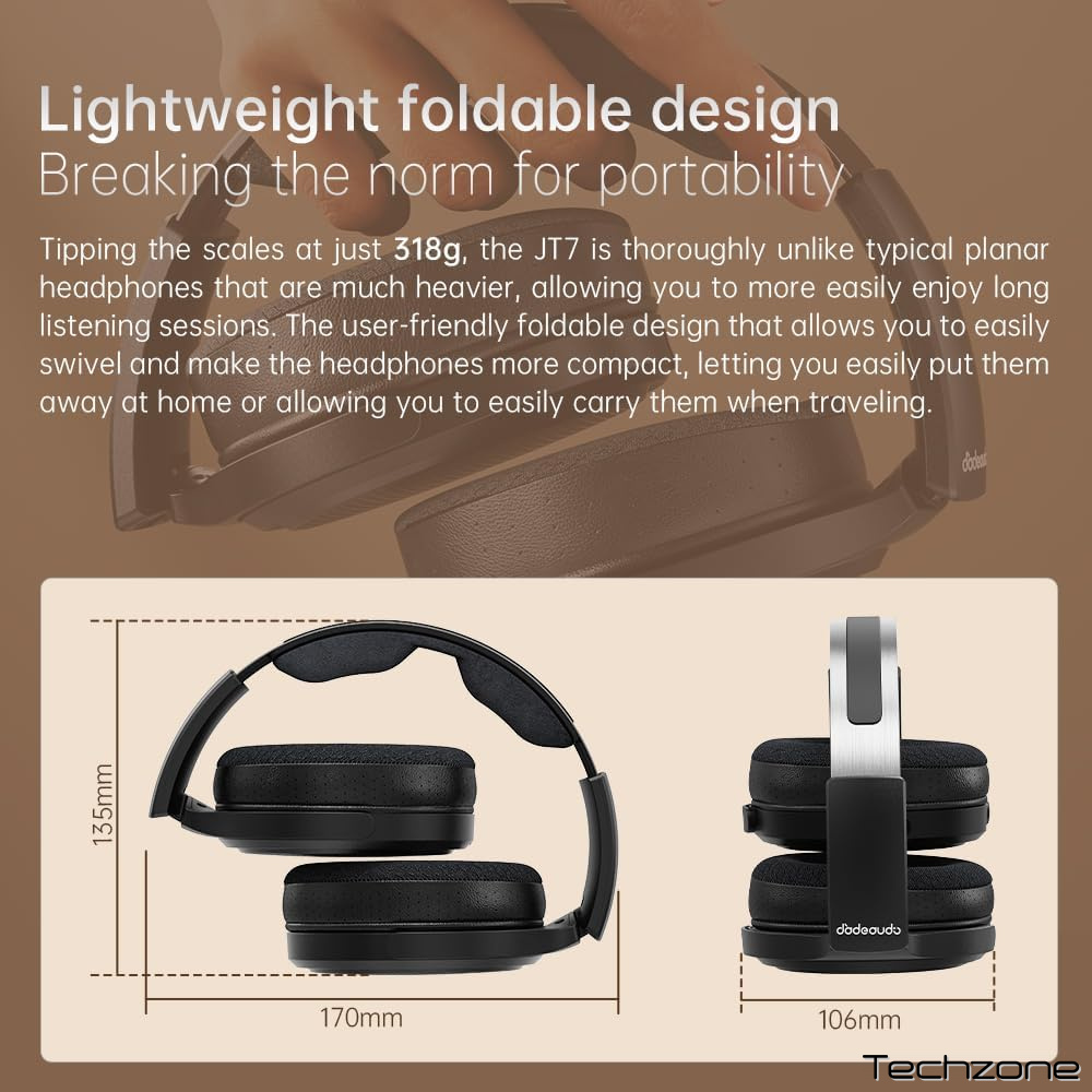 Легка вага та ергономічне оголов’я роблять JT7 зручними для тривалого прослуховування. Складаний механізм допомагає при зберіганні, а амбушюри, що дихають, знижують теплове відчуття навіть при довгому носінні. Можливість заміни амбушюр та подушки голови збільшує довговічність.