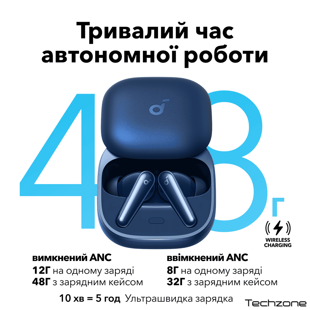 - 12 год / 48 год без ANC, 8 год / 32 год з ANC: 10-хвилинна зарядка дає ще 5 годин відтворення.