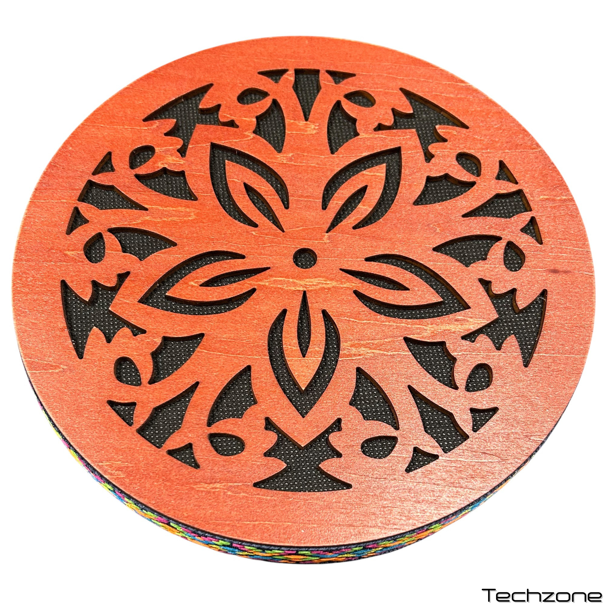 Діаметр барабана становить 20,32 см (8 дюймів), що робить його зручним для гри та транспортування. Каркас виготовлений з натурального дерева, а верхня кришка прикрашена декоративним візерунком із різьбленням, що не лише додає інструменту естетичної привабливості, але й підкреслює його автентичність. Натуральний колір деревини зберігає теплий та природний вигляд, гармонійно вписуючись у будь-який інтер’єр.