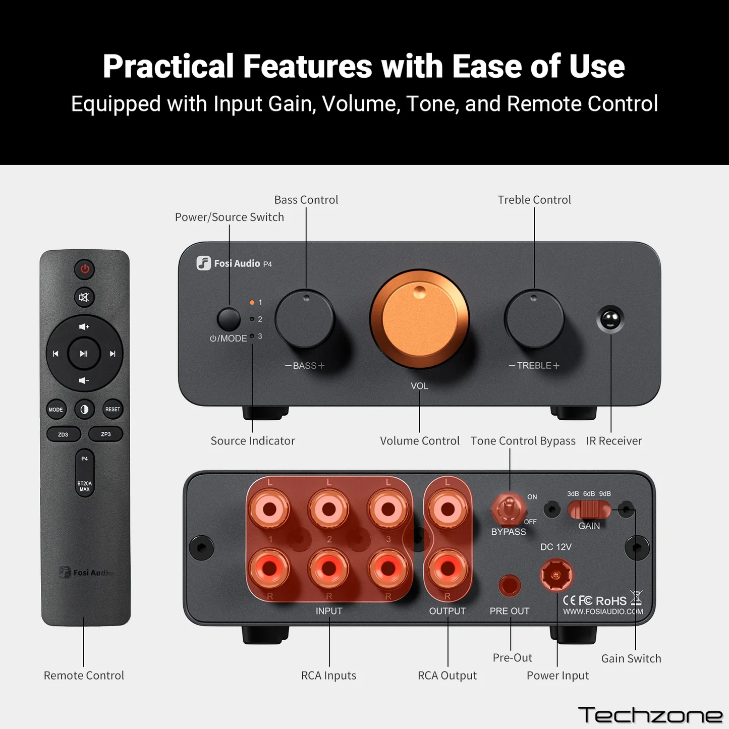 Fosi Audio P4 – це міні-передпідсилювач, розроблений компанією Fosi Audio на основі численних відгуків користувачів з усього світу після запуску стереопідсилювача V3. Він оснащений трьома входами, регулятором тембру і пультом дистанційного керування для зручного та індивідуального прослуховування звуку.