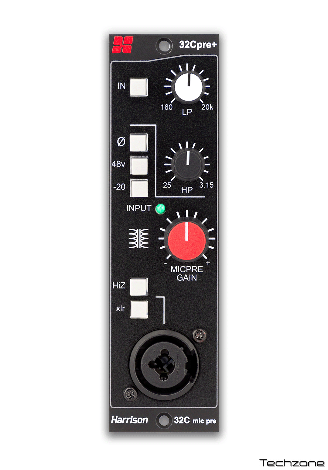32Cpre+ забезпечує плавне посилення від +20 до +70 дБ, що дозволяє використовувати широкий спектр мікрофонів, включаючи стрічкові. На додаток до перемикачів фази 180°, 48В, -20 pad і імпедансу HiZ, на передній панелі є комбінований XLR з роз'ємом ¼", що дозволяє підключати мікрофон або інструмент безпосередньо до 32Cpre+ без необхідності доступу до задньої панелі стійки серії 500.