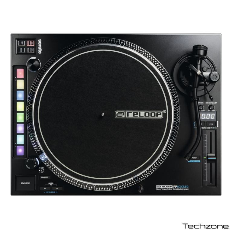 Reloop RP-8000 MK2 це гібридний вініловий програвач з високим обертовим моментом і прямим кварцовим приводом, добре підходить для діджеїв на вечірці або в клубі. Розроблений для інтеграції з Serato DJ Pro, RP-8000 MK2 пропонує можливість керування до семи різними режимами виконання через секцію педів. MK2 також включає режим Play Platter, який дозволяє використовувати педи для управління швидкістю обертання диска для створення мелодій. Цифровий РК-дисплей відображає інформацію про висоту звуку, BPM, призначення деки, масштабах і примітках, що пройшов / час, що залишився поточної доріжки і настройках прошивки. Дуже корисна функція дозволяє співставити BPM, що відслідковуються, не дивлячись при цьому на екран комп'ютера. 8 великих педів RGB можуть керувати 7-ма різними режимами виконання (Cue, Sampler, Saved Loops, Pitch Play, Loop, Loop Roll, Slicer), а також 2-ма призначеними для користувача режимами. Розміри 458 (ш) x 354 (г) x 144,6 (в) мм Вага: 11.8 кг