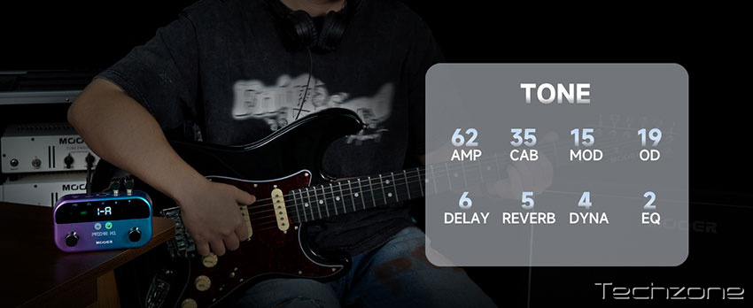 На відміну від флагманських процесорів MOOER серія Prime робить акцент на портативність і компактність. Minimax M1 важить лише 190 грамів і має довжину 12 см, що дозволяє легко помістити його в рюкзак або навіть кишеню, забезпечуючи зручність для гри та репетицій у будь-якому місці. Крім того, пристрій живиться від вбудованого літієвого акумулятора ємністю 2000 мАг і заряджається через USB, що робить його справді мобільним рішенням.
