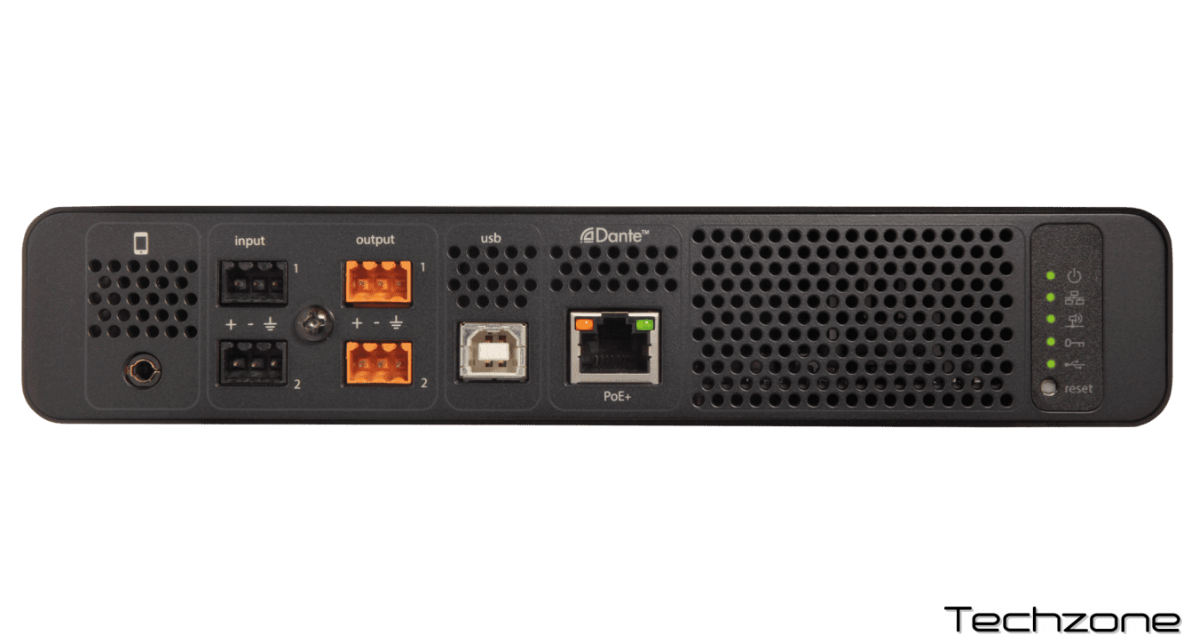 - Підключає 10 аудіовходів Dante, 2 аналогових входи, USB і мобільний пристрій до системи аудіо/відеоконференцій або програми для відеоконференцій на базі ПК