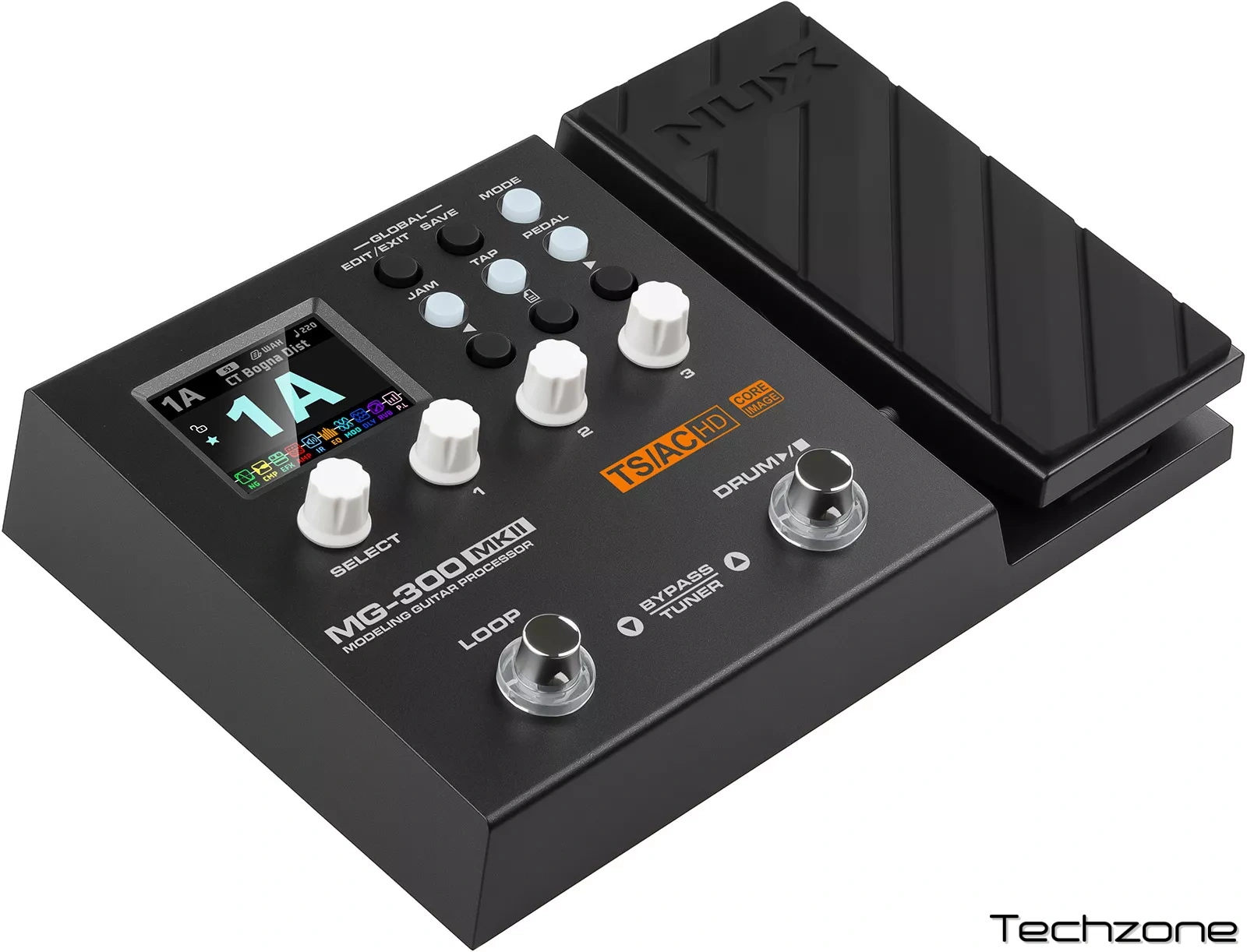 NUX MG300 MK II - це універсальний гітарний моделюючий процесор з розширеними можливостями для гравців, які шукають високоякісний звук і гнучкість. Він використовує 32-бітну обробку DSP і семплювання 24 біт/48 кГц для забезпечення чудового звучання, що робить його ідеальним для практики, запису і живих виступів. У MG-300 MKII поліпшено алгоритми моделювання, що призводить до більш реалістичного і натурального звучання. Ця модель має розширений набір функцій і нові ефекти, покращений лупер, більш гнучкі можливості редагування пресетів. Моделювальний процесор має інтуїтивно зрозуміліший і зручніший інтерфейс, що спрощує управління та налаштування пристрою, а також має кращу сумісність із сучасним програмним забезпеченням та операційними системами. Технічні характеристики: Передова технологія DSP: 32-бітний чип DSP з перетворенням AD/DA 24 біт/48 кГц для чистого, детального звуку. Моделювання підсилювачів і ефекти: 27 моделей підсилювачів: Включає різноманітні електричні, акустичні та басові тони. 10 типів ефектів: Охоплюють широкий спектр ефектів модуляції, затримки і реверберації. 36 патчів: Організовані в слоти 36+36, що дає змогу широко налаштовувати звук. IR Cabinet Simulation: 36 попередньо встановлених ІЧ-слотів для електричних, акустичних і басових тембрів. 36+24 додаткових користувацьких ІЧ-слотів. Частота дискретизації 512 для детальної емуляції кабінету. Барабанна машина і лупер: 68 ритм-шаблонів різних жанрів. Лупер зі стерео петлями (60 с) і моно петлями (120 с). Програмне забезпечення для редагування робочого столу: Редактор QuickTone для легкого налаштування звуку і функції USB-аудіоінтерфейсу (Normal, Loopback, Reamp, Dry Out). Універсальні входи/виходи: Гітарний вхід: 6,3-мм джек. Вхід Aux: 3,5-мм роз'єм. Вихід: 6,3-мм роз'єм для підключення мікшера, підсилювача або навушників. Порти USB: Micro-USB для редагування на ПК/Mac і аудіоінтерфейсу. Телефонний вхід TRRS: Для відтворення бек-треків з телефону. Розмір екрану - 2,4» Джерело живлення - DC 9V Розміри - 241*160*49 мм Вага - 760 г