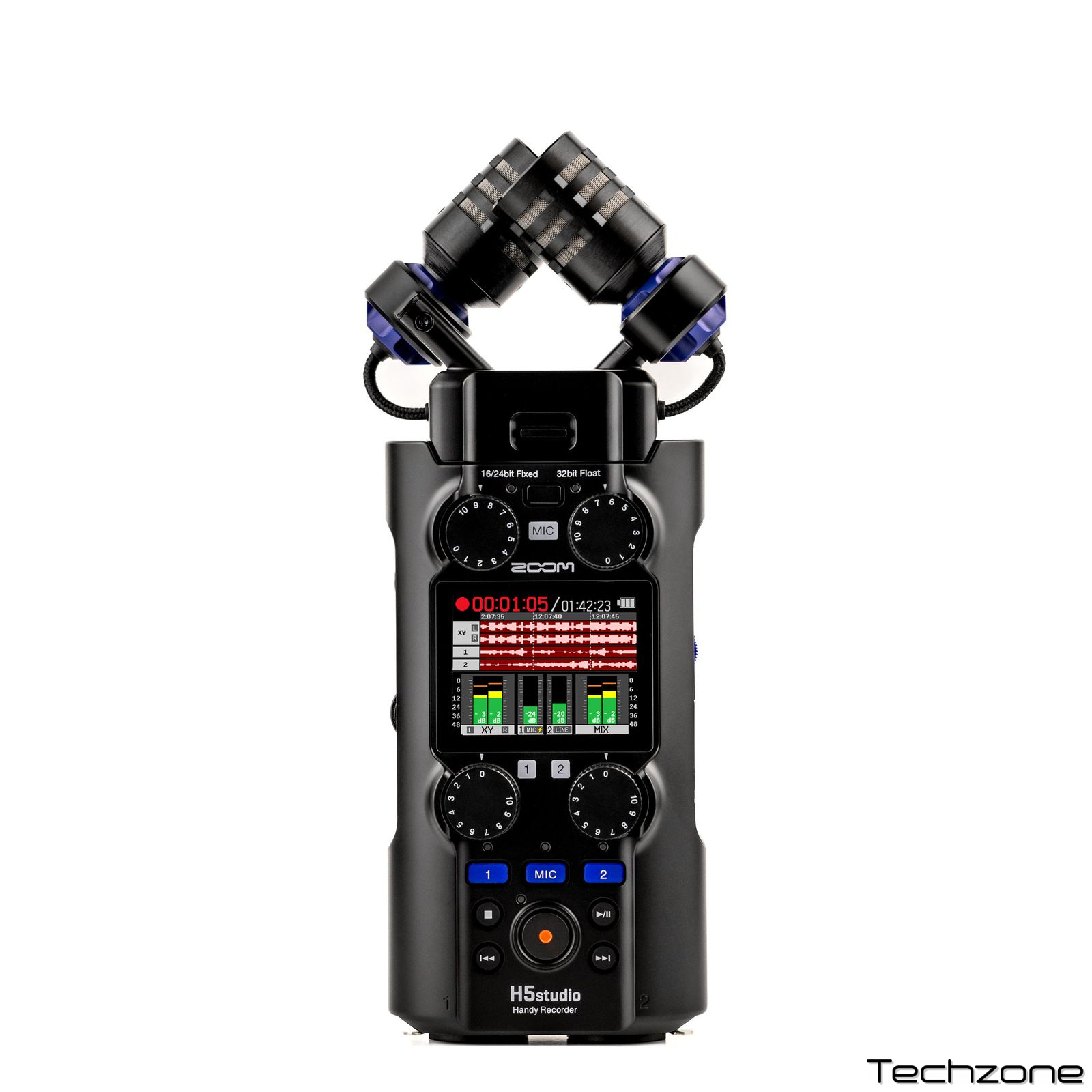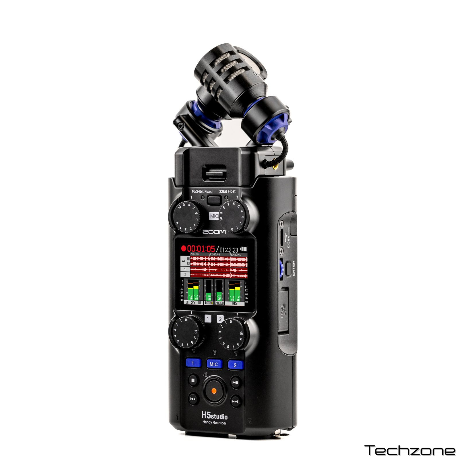 Zoom H5studio обладнаний преампами F-серії з показником EIN -127 дБu, які забезпечують звук без шумів. Подвійні АЦП і підтримка 32-бітного формату забезпечують динамічний діапазон 132 дБ, дозволяючи записувати навіть найтихіші звуки без спотворень.
