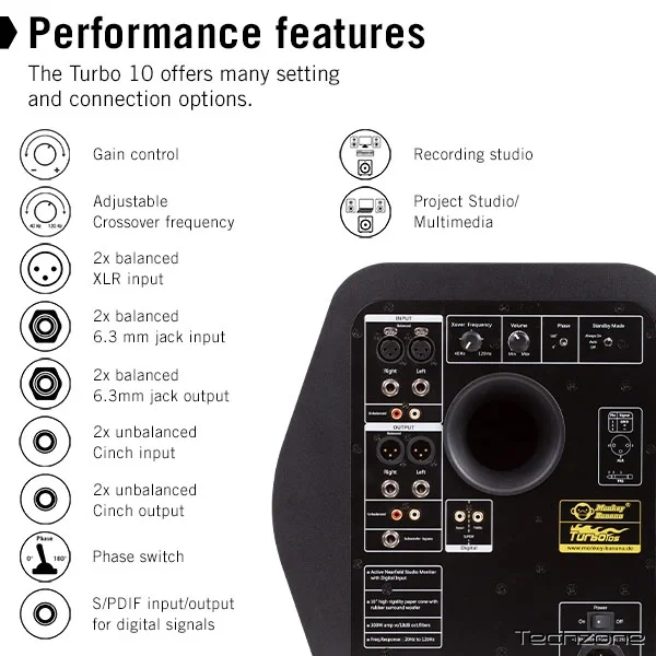 Turbo 10s - активний сабвуфер для застосування в професійних студіях звукозапису та мастерингу. Ідеально узгоджений з серією Turbo, він значно розширює діапазон низьких частот. Крім того, ця модель є ідеальною підтримкою глибоких басів для DJ-моніторингу. Завдяки регульованому кросоверу, сабвуфер Turbo 10s можна ідеально поєднувати з усіма моделями Turbo.