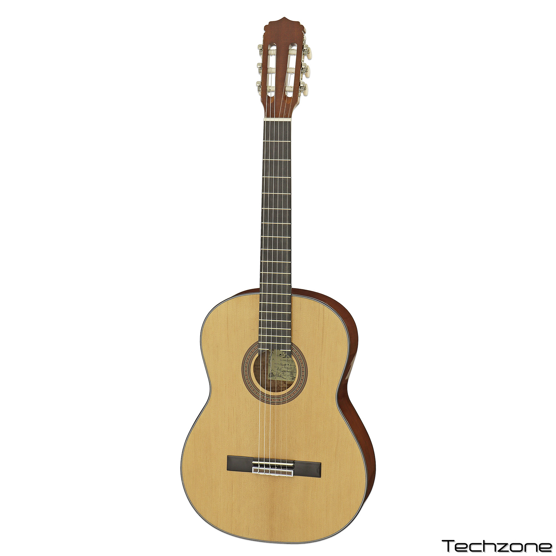 Акустична класична гітара. Верхня дека: ялина Задня дека та обичайки: сапелі Гриф: нато З’єднання грифа: ластівчин хвіст (Dovetail) Накладка грифа: палісандр Кількість ладів: 19 Верхній поріжок: ABS Ширина поріжка: 52 мм Мензура: 650 мм (25-1/2″) Бридж: палісандр Седло: ABS Фурнітура: хром Покриття: глянцевий натуральний Чохол в комплекті