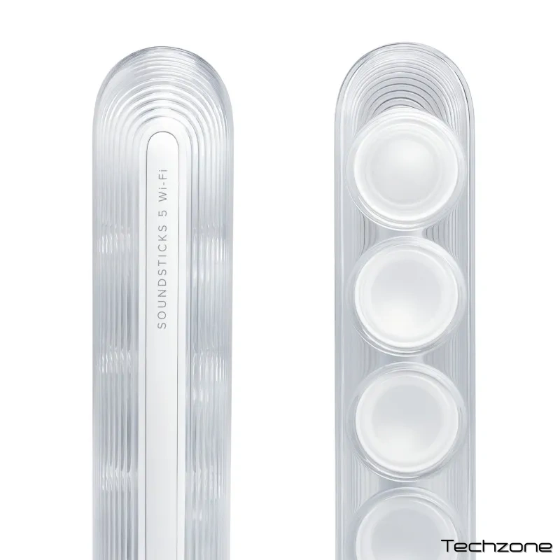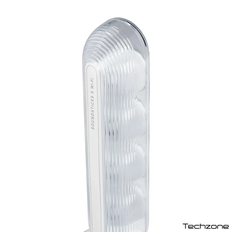 SoundSticks 5 Wi-Fi знову відкриває свою культову силуетну форму у світлому білому оздобленні, що додає будь-якому простору невимушеної елегантності. Повністю прозорий купол і прозорі сателітні колонки доповнені полірованими металевими деталями — для чистої, витонченої естетики, яка пасує сучасним інтер’єрам. У кожному елементі — простота: від лаконічного заднього блоку підключень до чутливих сенсорних кнопок на основі правої колонки. У результаті — преміальний досвід, що виглядає вишукано й відчувається легко.