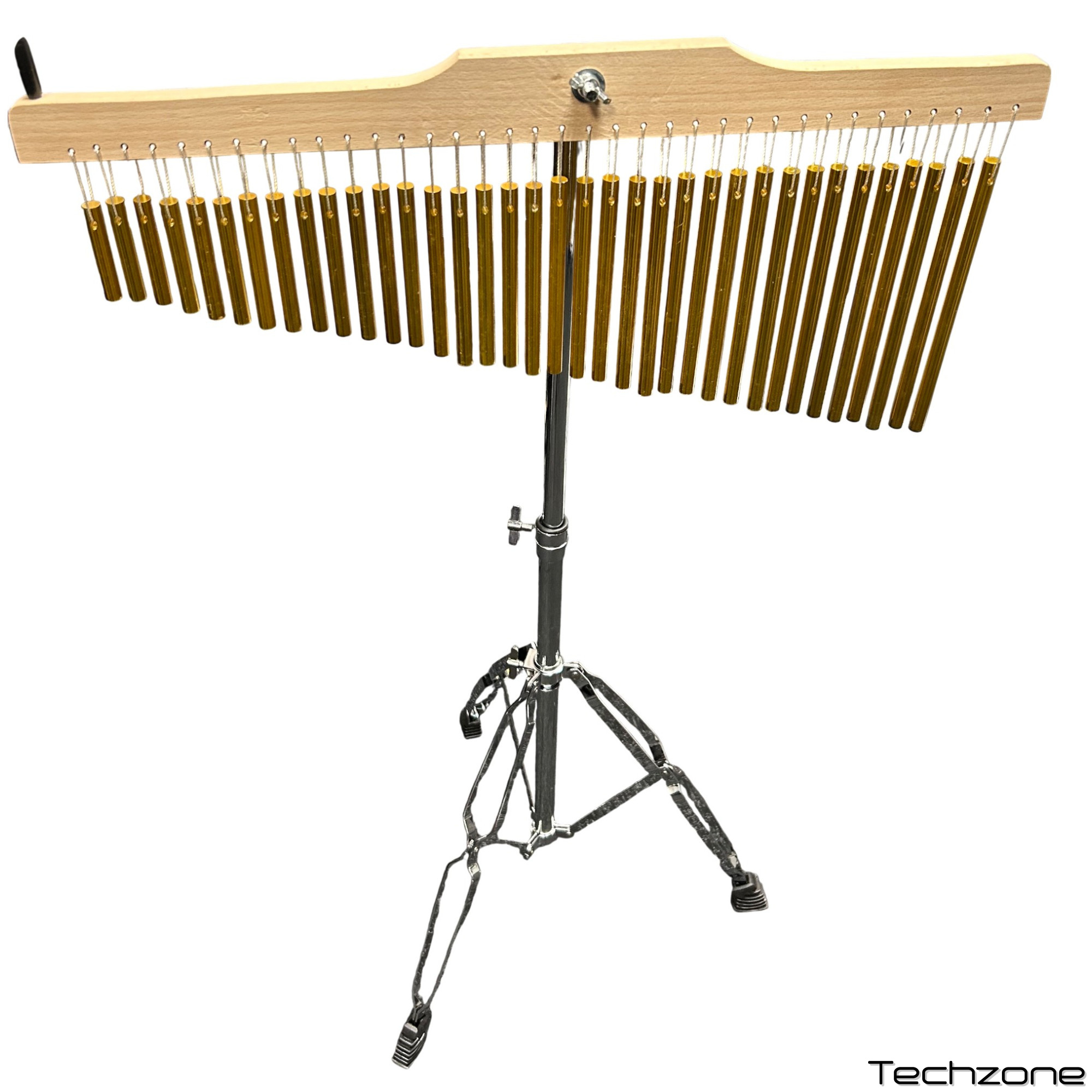 Конструктивно инструмент сделан из деревянной планки, к которой на деликатно натянутых нитях прикреплены алюминиевые трубки. Сочетание дерева и металла не только обеспечивает приятный тактильный контакт, но и создает сбалансированный тембральный отклик: деревянное основание мягко сглаживает верхние обертоны, металлические трубки придают яркости и атаки. Такая конструкция также гарантирует стойкость звука и надежность в использовании на сцене или студии.