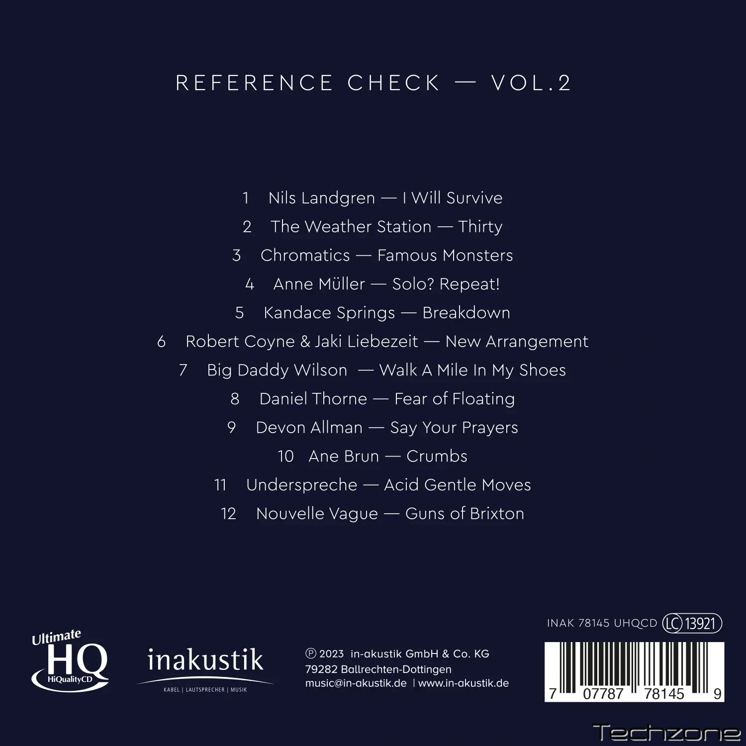 Саме звук створює музику. Відчуйте досконалість найкращої музики. З творами, сповненими глибини. Немає компромісів, коли йдеться про те, що захоплює Canton. У нас усіх є одна спільна пристрасть – музика. Не просто будь-яка музика, а найкраща музика. Пісні, які нас надихають. Звуки, які змушують нас заплющити очі та забути про навколишній світ. Для Reference Check Vol 2 Canton знову склав добірку з 12 улюблених творів – кожен з них має свої власні нюанси. Відкрийте для себе середні тони. Ці 12 творів – це подорож відкриттів для ваших вух, яка, таким чином, випробовує всі динаміки на міцність. Щоб наблизити якість звуку до якості майстра, цей запис завантажено на Ultimate HiQuality CD (UHQCD). Високоякісний Mediabook доповнює пакет. • Ultimate HiQuality CD (UHQCD)