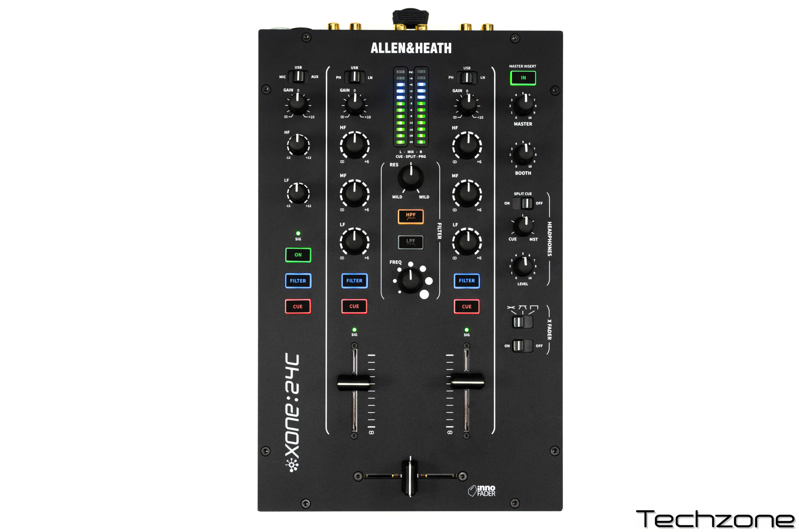 Allen & Heath Xone:24C зберігає фірмове аналогове звучання, характерне для серії Xone , завдяки ретельно спроєктованому трактові сигналу з низьким рівнем шуму та високим запасом динаміки. У парі працюють високоякісні RIAA-передпідсилювачі, що точно передають характер вінілу, а комбіновані входи Phono/Line дозволяють швидко перемикатись між програвачами й цифровими джерелами без втрати якості. Тришмуговий ізолятор EQ надає повний контроль над частотами — від м’яких переходів до виразних креативних зрізів, роблячи мікс більш гнучким та живим.