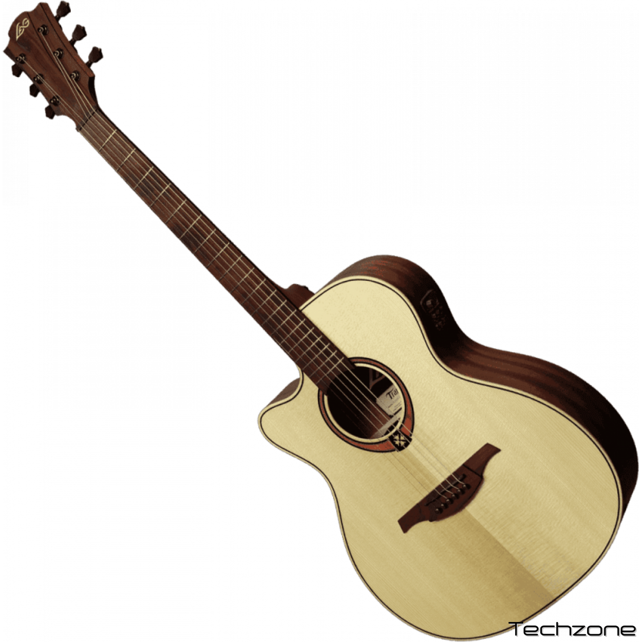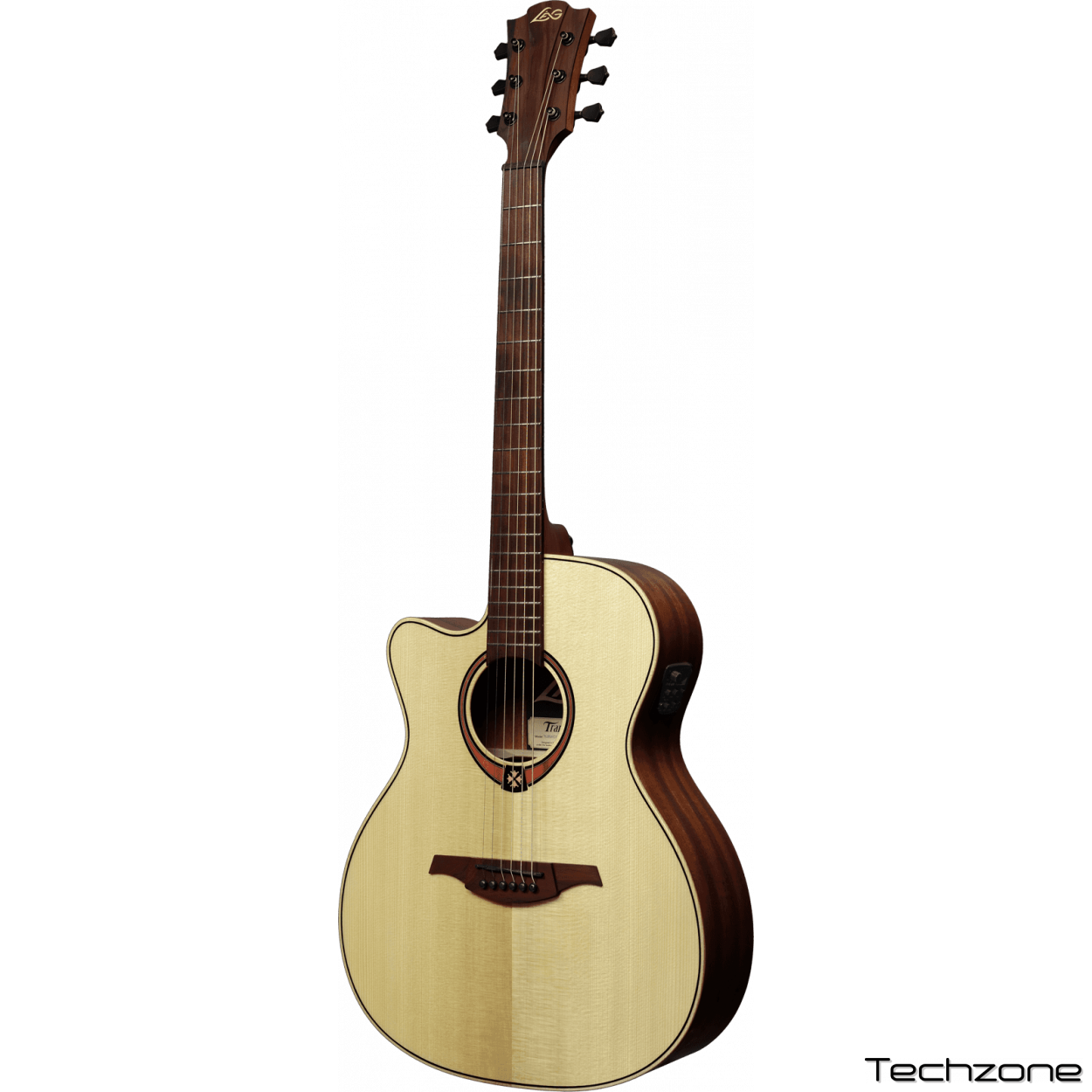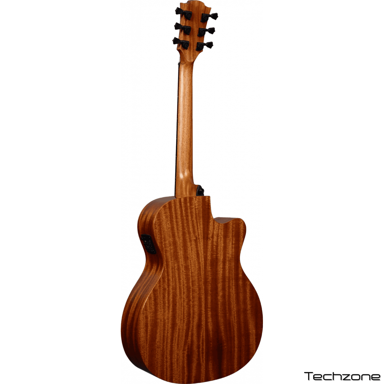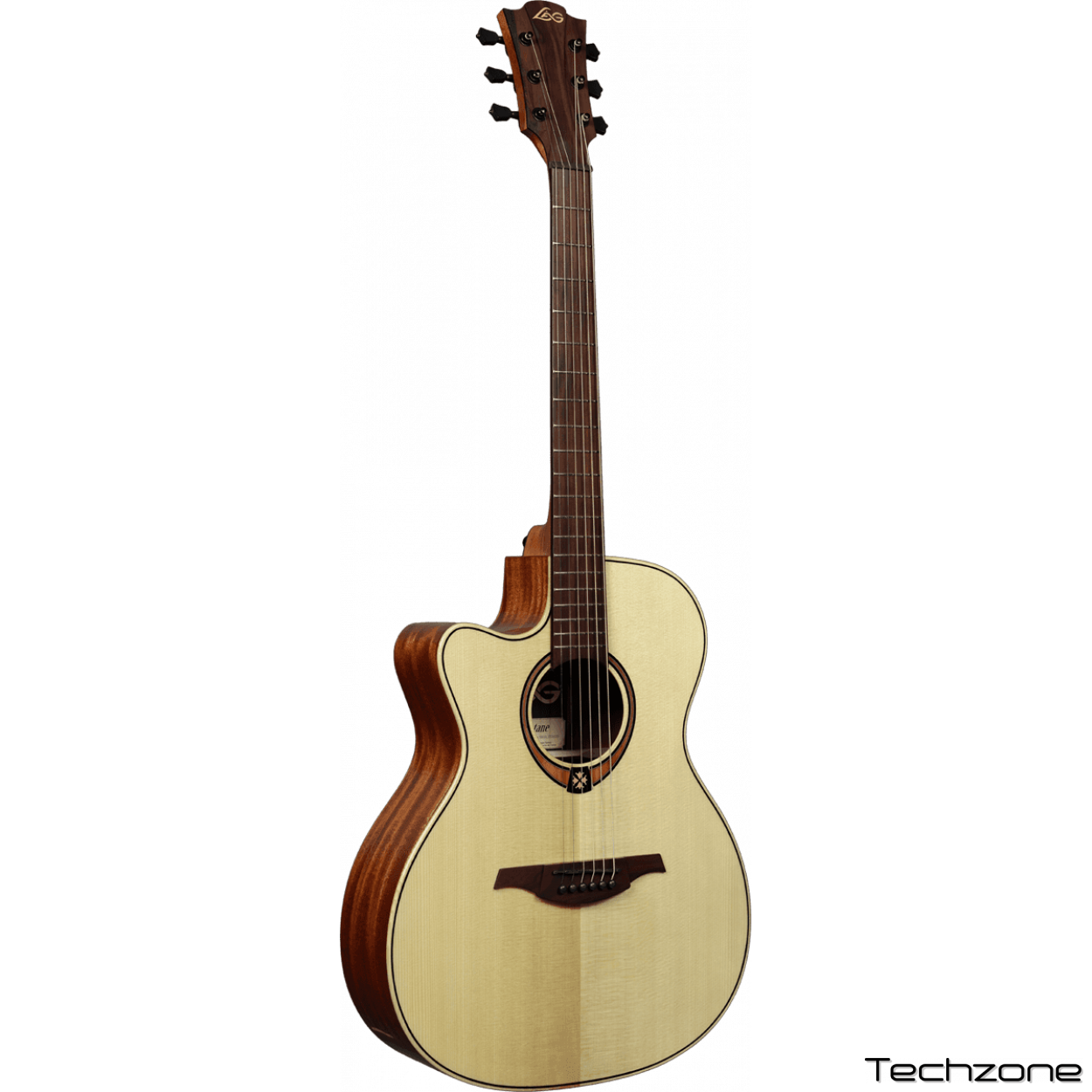 Левосторонняя электроакустическая гитара формы аудиториум с вырезом. Нижняя дека, обечайки и гриф - из дерева Тропической Хайи, накладка на гриф и бридж из коричневой древесины (Браунвуд). Эта гитара имеет 20 ладов, графитовые верхний и нижний порожек. Механика - литая, черная, покрытие атласное. На гитару установлен предусилитель Stage-Lag.