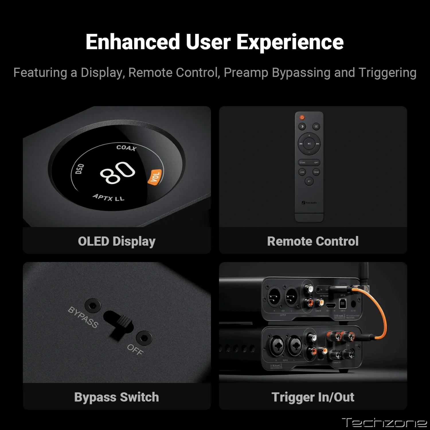 Оснащений 1.5-дюймовим OLED-дисплеєм, пультом дистанційного керування, перемикачем обходу попереднього підсилювача та тригером 12V in/out для синхронного вмикання/вимикання з іншими аудіопристроями. Усе це для зручного користувацького досвіду.