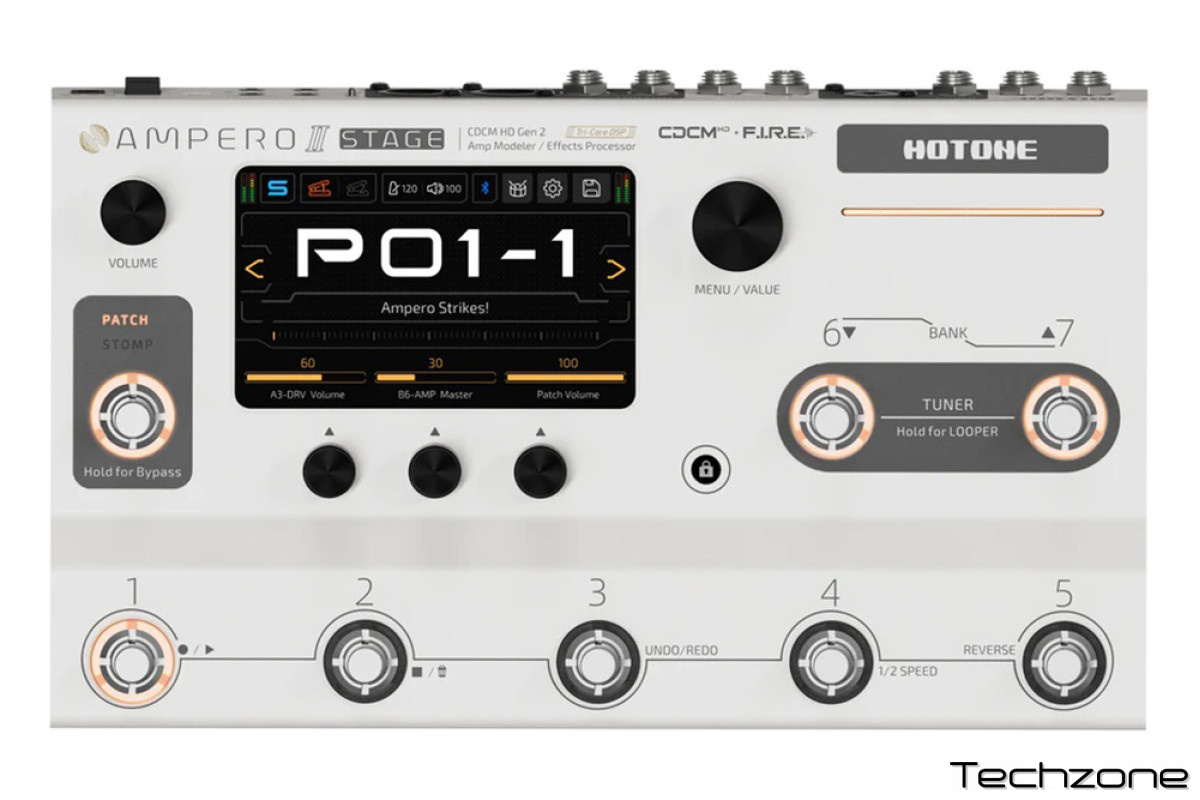 Hotone Audio Ampero Stage II– моделирующий гитарный процессор эффектов, 460 эффектов, до 12 эффектов одновременно, 90 моделей усилителей, 68 моделей кабинетов, 100 моделей педалей, моделирование микрофона, 5» сенсорный экран, 8 футсвичей, все необходимые разъемы, цвет белый.Hotone Ampero II Stage– это продвинутый моделирующий процессор эффектов, который открывает новые горизонты для живых выступлений и студийной работы. Оснащенный мощной трехъядерной цифровой платформой и премиальными АЦП/ЦАП серииESS Sabre, он обеспечивает непревзойденное качество звука. Независимо от масштаба вашего выступления – будь то большая сцена или уютный клуб, этот процессор станет вашим идеальным спутником.Особое внимание вAmpero II Stageуделено удобству управления и сценической функциональности. Процессор предлагает два режима работы:PATCHиSTOMP. В режимеSTOMPсемь ножных переключателей можно настроить для управления отдельными модулями эффектов, что дает полный контроль над звуком. В каждом патче доступно до пяти сцен, позволяя легко переключать эффекты и параметры для разных частей композиций, обеспечивая плавные звуковые переходы.Устройство поддерживает широкий диапазон входов, включая комбинированный правый канал с фантомным питанием 48 В для подключения микрофонов. Это делаетAmpero II Stageуниверсальным выбором для гитаристов, басистов, клавишников и вокалистов. ФункцияTone Catchпозволяет захватывать звук любимых усилителей и педалей, а встроеннаяBluetooth-связь открывает возможности беспроводного управления и обмена пресетами.Процессор предлагает гибкую архитектуру двойных цепочек эффектов с поддержкой до 12 модулей, что позволяет комбинировать эффекты в последовательной или параллельной схемах. С 20 сертифицированными моделями кабинетовCelestionи поддержкой до 2048 точек сэмплирования, ваш звук будет звучать с невероятной детализацией.Ampero II Stageтакже оснащен функцией USB-аудиоинтерфейса с 8x8 каналами и переменной частотой дискретизации до 192 кГц, идеально подходящей для записи и потоковой передачи.Эргономичный дизайн дополняется 5-дюймовым сенсорным экраном с интуитивно понятным интерфейсом.Ampero II Stageобъединяет все функции для профессионального выступления, от управления звуком до встроенного лупера и драм-машины с 100 ритмами. Это решение «все в одном», которое вдохновляет музыкантов на творчество и улучшение своих навыков.Способы подключения:Подключение ко входу усилителяПодключите выходAmpero II Stageко входу усилителя. Вы можете использовать дополнительные внешние контроллеры или другие педали эффектов в петлеFX Ampero II Stage, если это необходимо.Подключение к FX-петле возврата усилителей или входа чистого послекаскадного усилителя мощности (например, Loudster)При подключении к усилителям мощности вы можете регулировать параметрыAmpero II Stageтак же как и настоящего усилителя. При подключении к разъемуFX Loop Returnопределенных гитарных усилителей, вы получите максимальное удовольствие от использования специально разработанных модулейPRE AMPвAmpero II Stage.Сдвоенные выходы на сценеРекомендуем использовать шаблон цепиY-A/B:Цепь A:обычный выход с симулятором кабины, посылается непосредственно на микшерный пульт через XLR выходы;Цепь B:без симулятора кабинетов, посылается на сценические инструментальные усилители через несимметричные выходы для мониторинга; в этом случае вы также можете подключить инструм