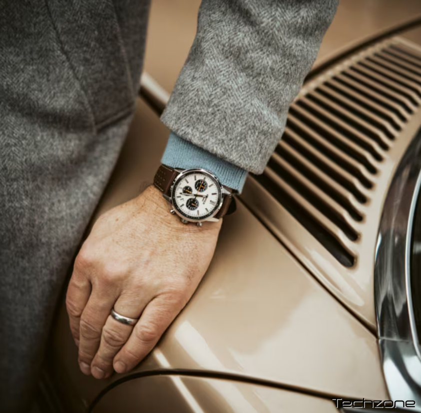 Двоколірний циферблат має контрастні кольори для основного та вбудованого циферблатів, що нагадує вигляд приладової панелі класичного спортивного автомобіля.